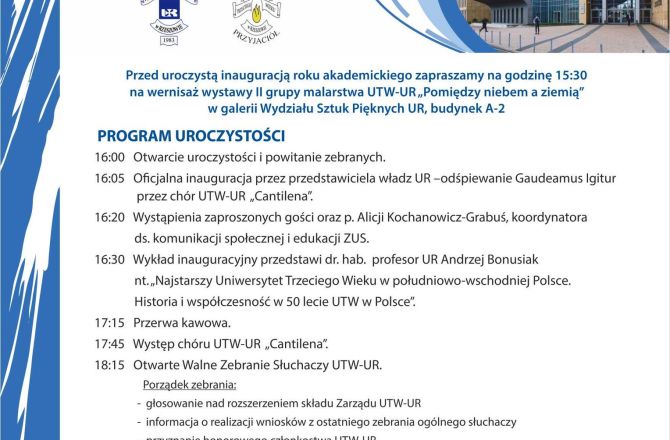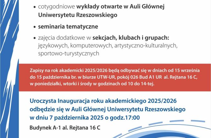 Podstawowe informacje organizacyjne. Zapisy odbywać się będą w godzinach pracy biura 10.00-14.00: poniedziałek, wtorek, środa, od 15.09. do 15.10.2025; przy zapisie należy przedstawić dowód opłacenia składki UTW-UR.