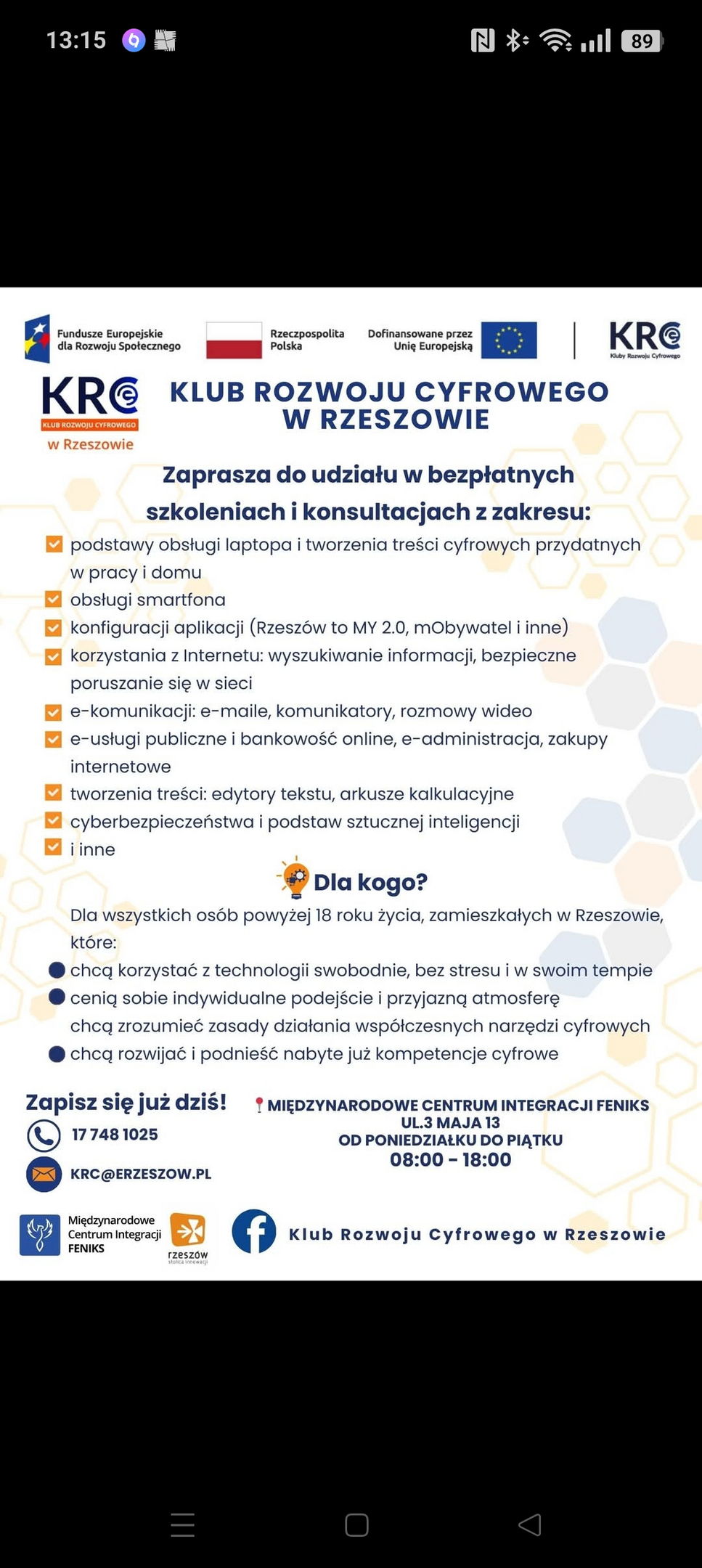Dodatkowo KRC w dniach 05.11. i 06.11.2025 w godz. od 14:30 do 16:30 - organizuje szkolenie/ warsztaty w zakresie e-uslugi publiczne, bankowość online, e-administracja, konfiguracja aplikacji, itp.