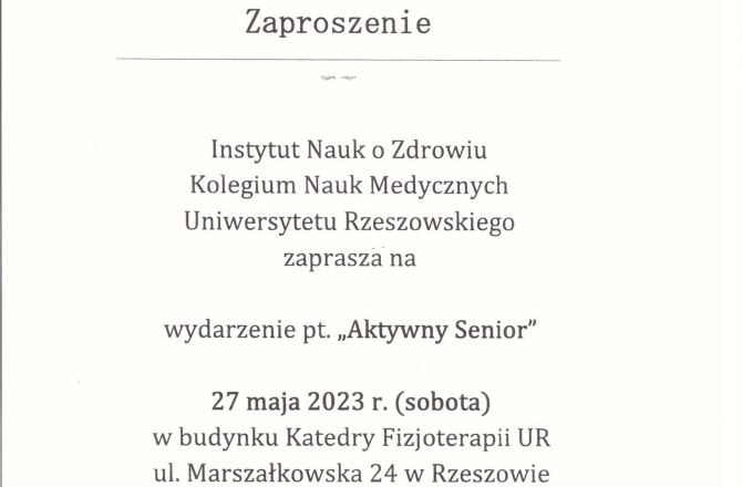 Instytut Nauk o Zdrowiu Kolegium Nauk Medycznych UR zaprasza na wydarzenie 27 maja 2023 r. /sobota/ w godz. 9.00-14.00 w budynku Katedry Fizjoterapii UR ul. Marszałkowska 24 - program w załączeniu.