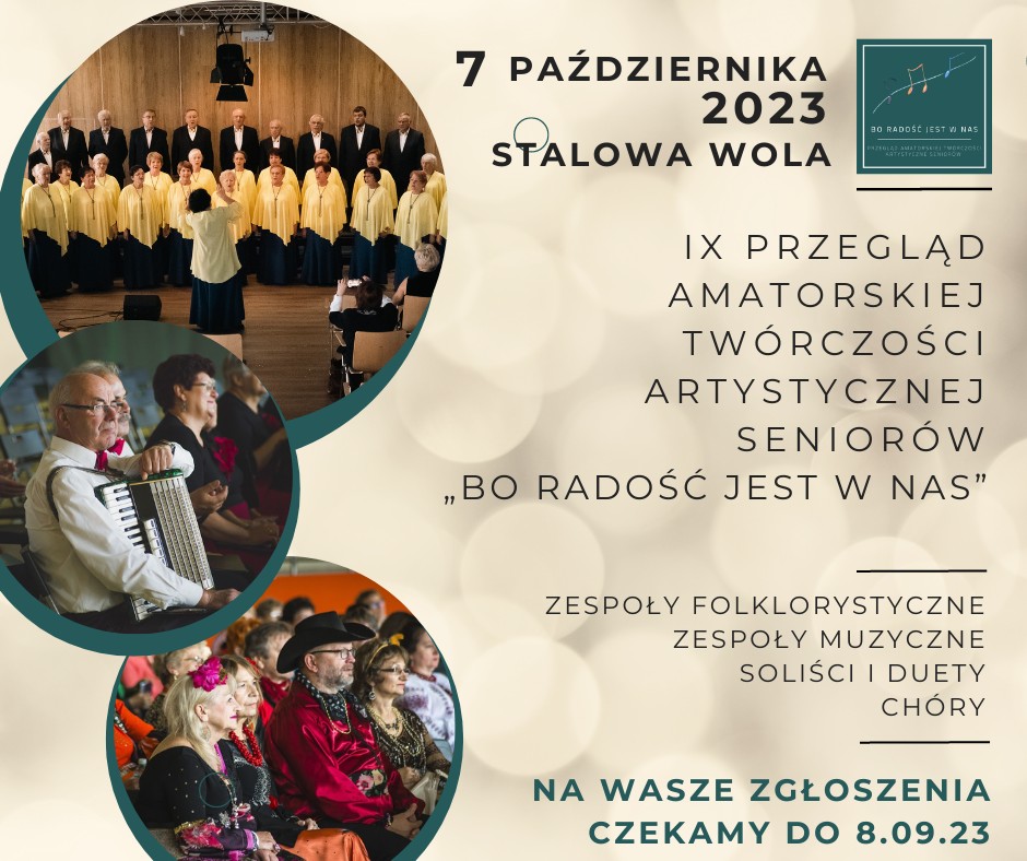 Już w dniu następnym, w sobotę 7 października br. Chór UTW-UR "Cantilena" wyjeżdża do Stalowej Woli, gdzie weźmie udział w dorocznym Przeglądzie Twórczości Artystycznej Seniorów „Bo Radość Jest w Nas”. Jest to przedsięwzięcie na szeroką skalę, w którym biorą udział Seniorzy amatorzy z całej południowej Polski. Przegląd odbywa się w różnych kategoriach i formacjach muzycznych; zespoły wokalne, instrumentalne i taneczne, kapele, chóry, duety i soliści. Nasz Chór od wielu już lat uczestniczy w tym prestiżowym Przeglądzie, reprezentując rzeszowski UTW i niejednokrotnie zdobywając wysokie nagrody i wyróżnienia. Lecz, jak podkreślają chórzyści, jadą tam przede wszystkim aby spotkać się z innymi seniorami o podobnej pasji oraz dla doznań wspaniałej atmosfery i r a d o ś c i tam panującej. Życzymy naszej „Cantilenie” powodzenia.