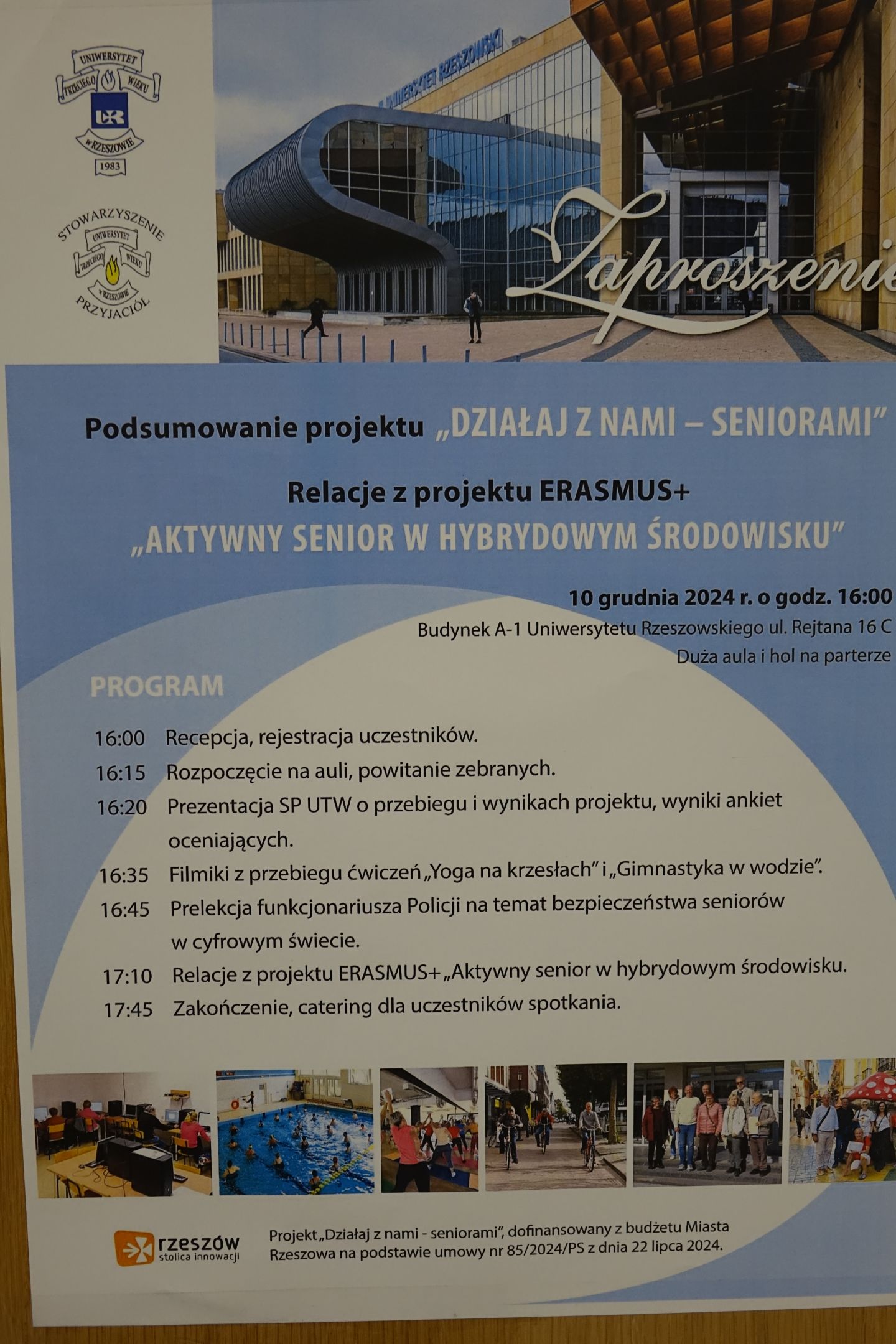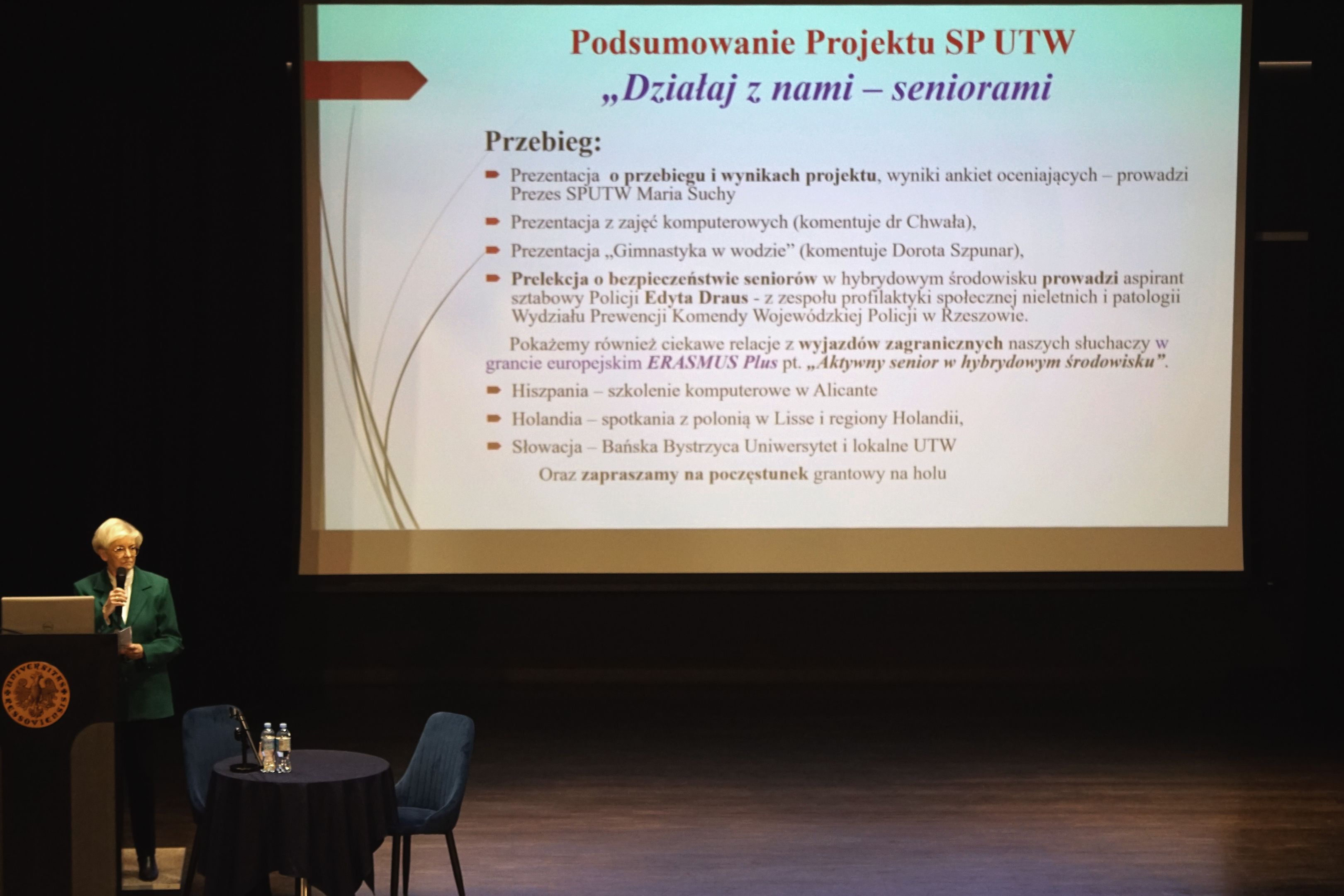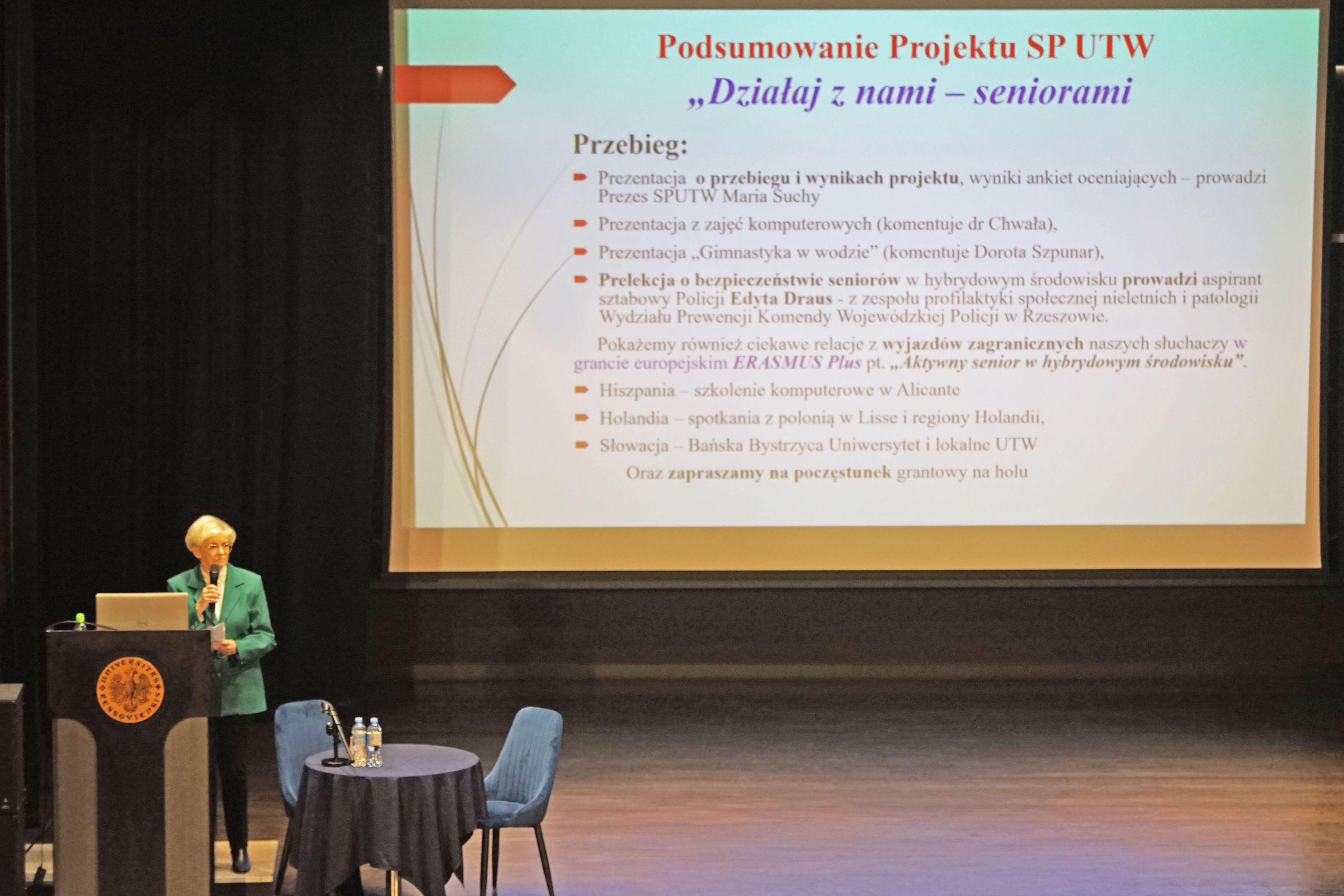 We wtorek 10 grudnia 2024 r. odbyło się uroczyste podsumowanie projektu „DZIAŁAJ Z NAMI – SENIORAMI”. Uczestnikami projektu, realizowanego na podstawie umowy dotacji Nr 85/2024/PS podpisanej z Gminą Miasto Rzeszów w dniu 22 lipca 2024 przez Stowarzyszenie Przyjaciół UTW w Rzeszowie, byli słuchacze UTW-UR.  Przybyłych na wydarzenie powitała Prezes UTW-UR kol. Danuta Kamieniecka–Przywara. Wśród zaproszonych gości obecni byli: pani Elżbieta Inglot–Brzęk z Wydziału Polityki Społecznej Urzędu Miasta Rzeszowa, aspirant Sztabowy Edyta Draus - asystent zespołu ds. profilaktyki społecznej nieletnich i patologii z Wydziału Prewencji Komendy Wojewódzkiej Policji w Rzeszowie, pani red. Anna Leśniewska z Polskiego Radia Rzeszów, a także osoby z Rzeszowskiego Ośrodka Sportu i Rekreacji: pani Mariola Bura oraz pani Anna Gardzielik-Musiał. Obecni byli także pracownicy naukowi UR zaangażowani w realizację Projektu UR w programie ERASMUS+: dr Tomasz Warzocha z instytutu Pedagogiki i dr Paweł Łuka z Instytutu Nauk o Kulturze Fizycznej. Obecnych było także ponad 100 słuchaczy UTW-UR i mieszkańców miasta.