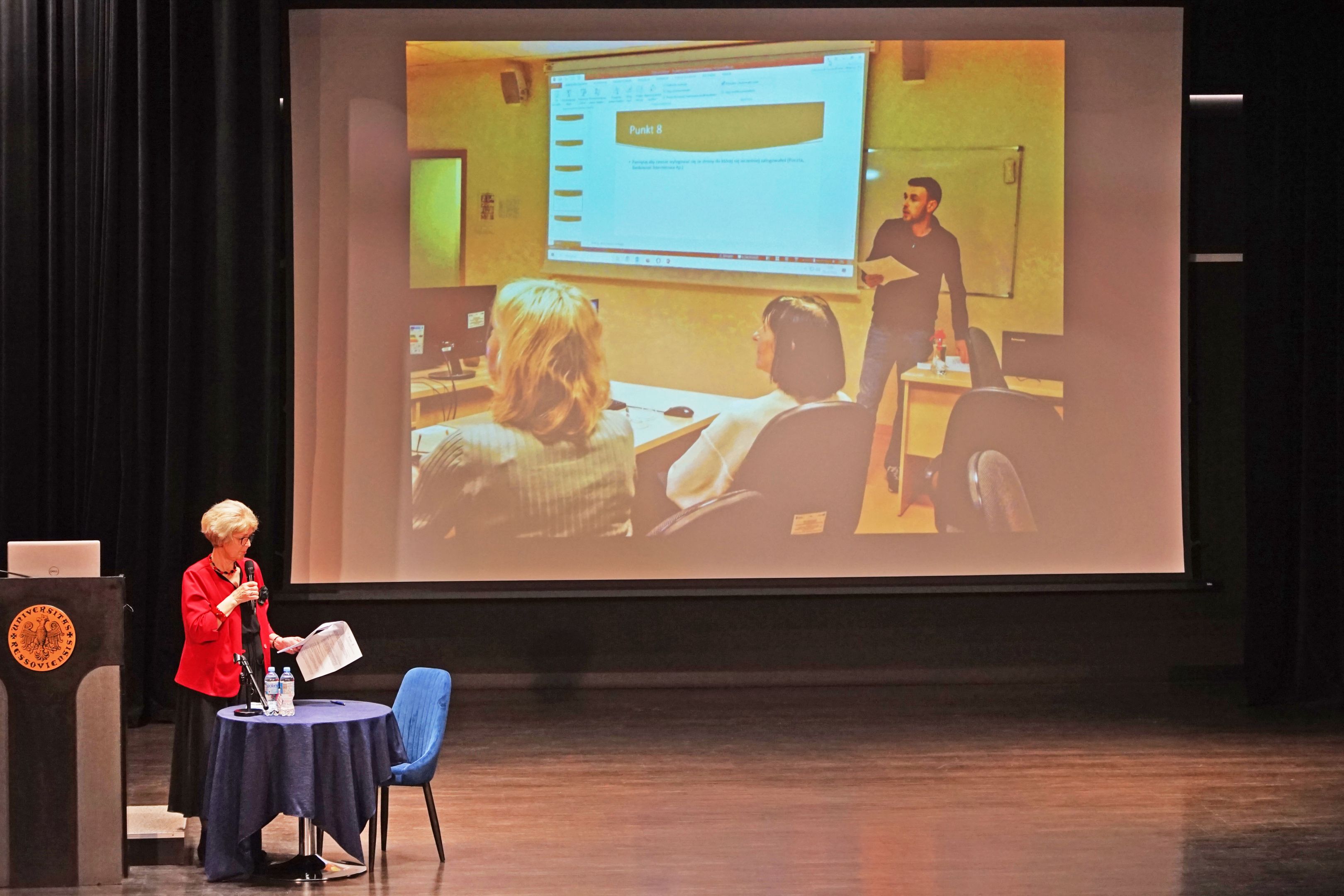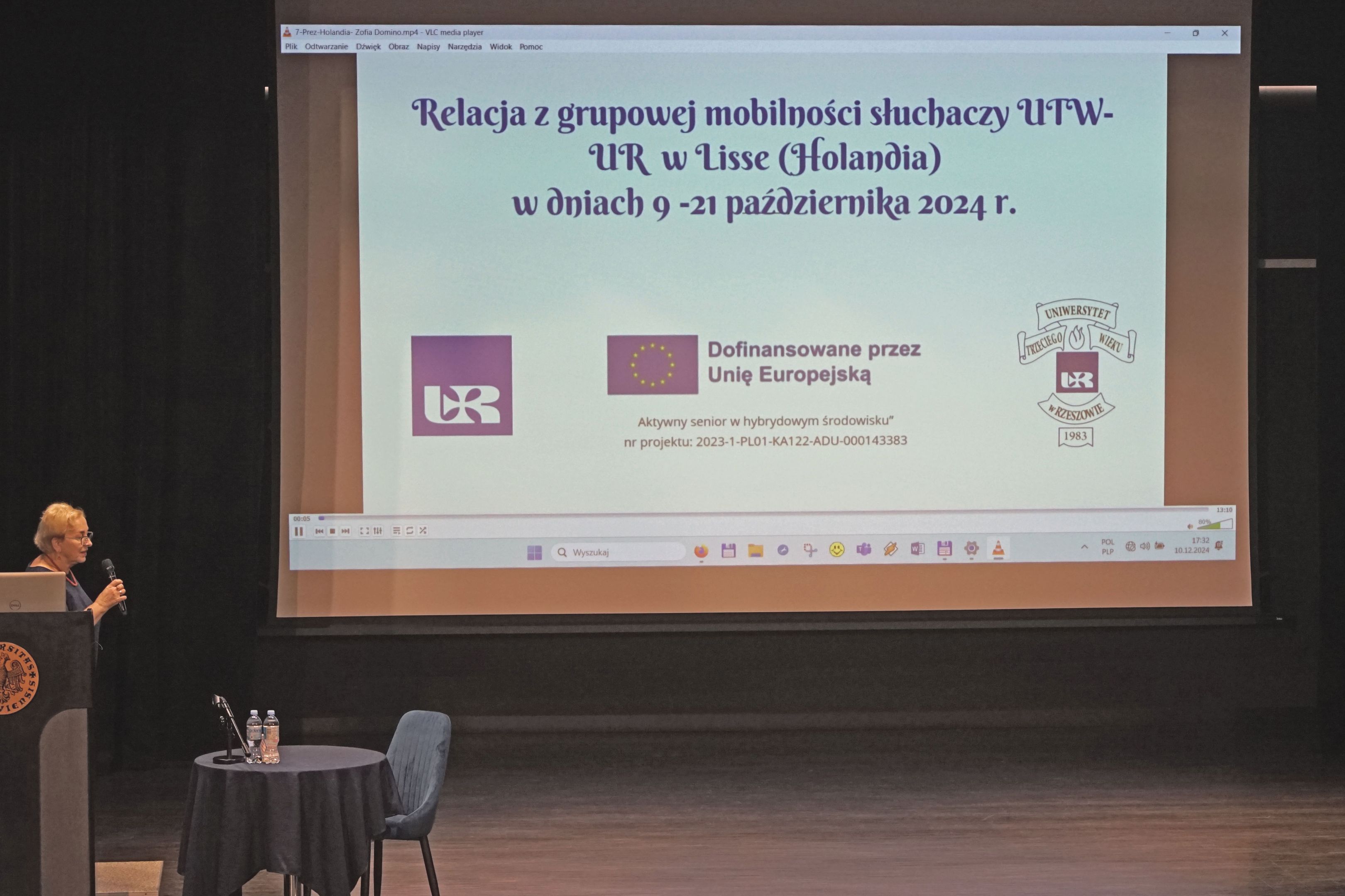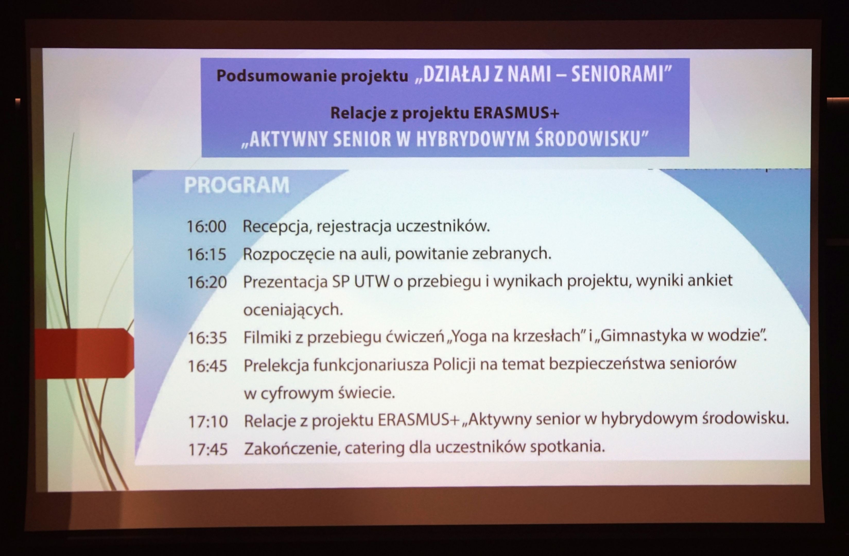 We wtorek 10 grudnia 2024 r. odbyło się uroczyste podsumowanie projektu „DZIAŁAJ Z NAMI – SENIORAMI”. Uczestnikami projektu, realizowanego na podstawie umowy dotacji Nr 85/2024/PS podpisanej z Gminą Miasto Rzeszów w dniu 22 lipca 2024 przez Stowarzyszenie Przyjaciół UTW w Rzeszowie, byli słuchacze UTW-UR.  Przybyłych na wydarzenie powitała Prezes UTW-UR kol. Danuta Kamieniecka–Przywara. Wśród zaproszonych gości obecni byli: pani Elżbieta Inglot–Brzęk z Wydziału Polityki Społecznej Urzędu Miasta Rzeszowa, aspirant Sztabowy Edyta Draus - asystent zespołu ds. profilaktyki społecznej nieletnich i patologii z Wydziału Prewencji Komendy Wojewódzkiej Policji w Rzeszowie, pani red. Anna Leśniewska z Polskiego Radia Rzeszów, a także osoby z Rzeszowskiego Ośrodka Sportu i Rekreacji: pani Mariola Bura oraz pani Anna Gardzielik-Musiał. Obecni byli także pracownicy naukowi UR zaangażowani w realizację Projektu UR w programie ERASMUS+: dr Tomasz Warzocha z instytutu Pedagogiki i dr Paweł Łuka z Instytutu Nauk o Kulturze Fizycznej. Obecnych było także ponad 100 słuchaczy UTW-UR i mieszkańców miasta.