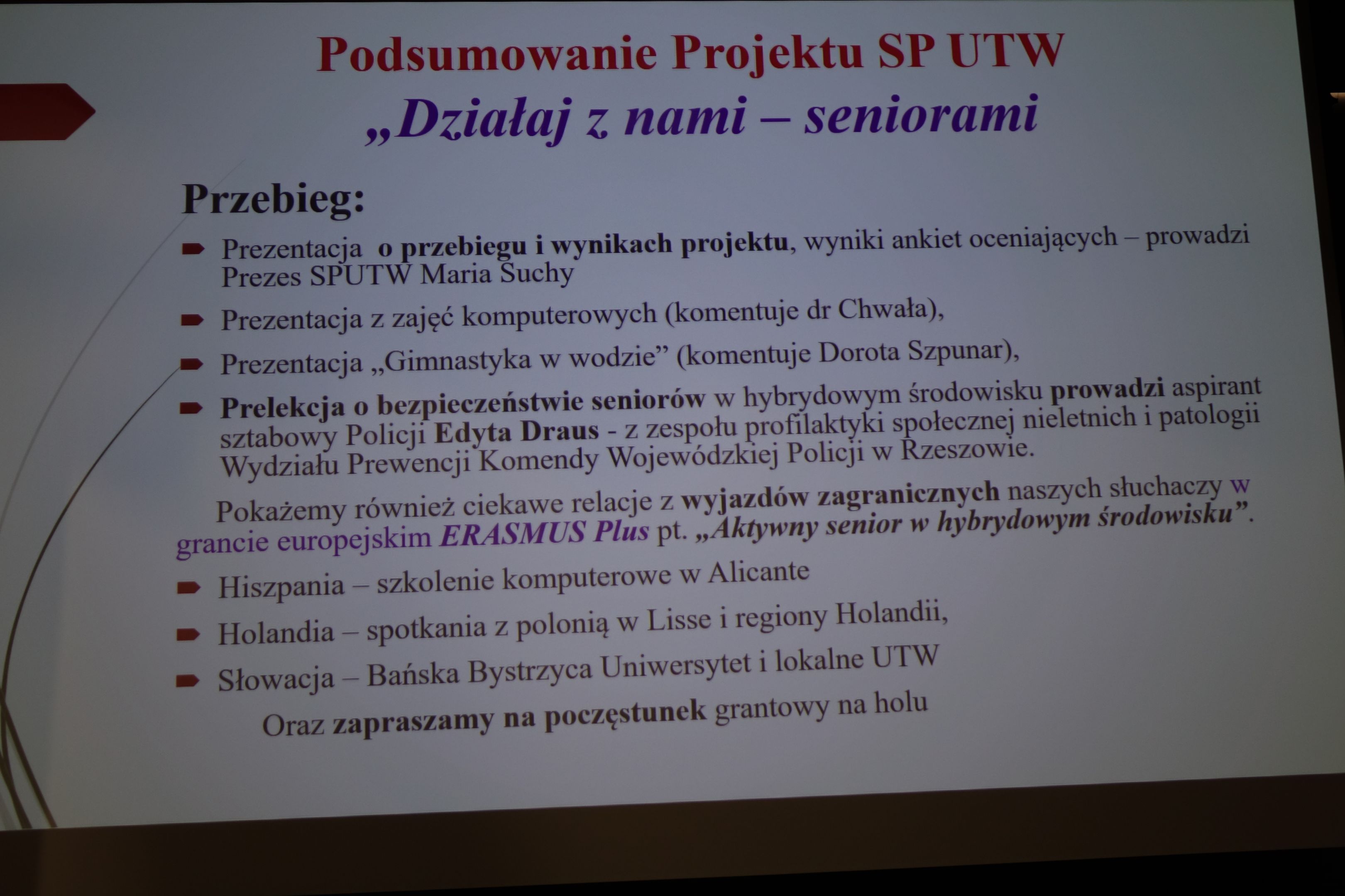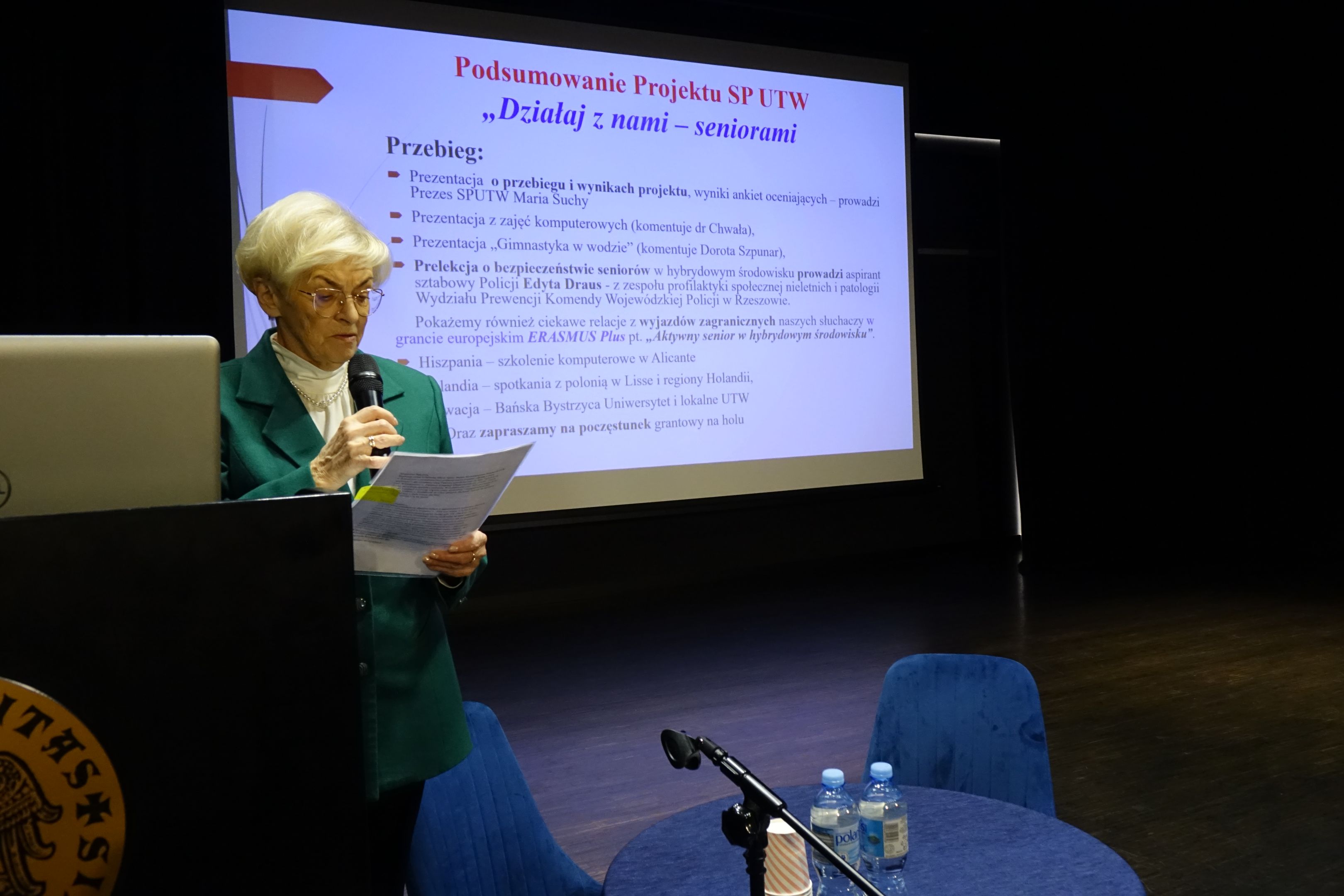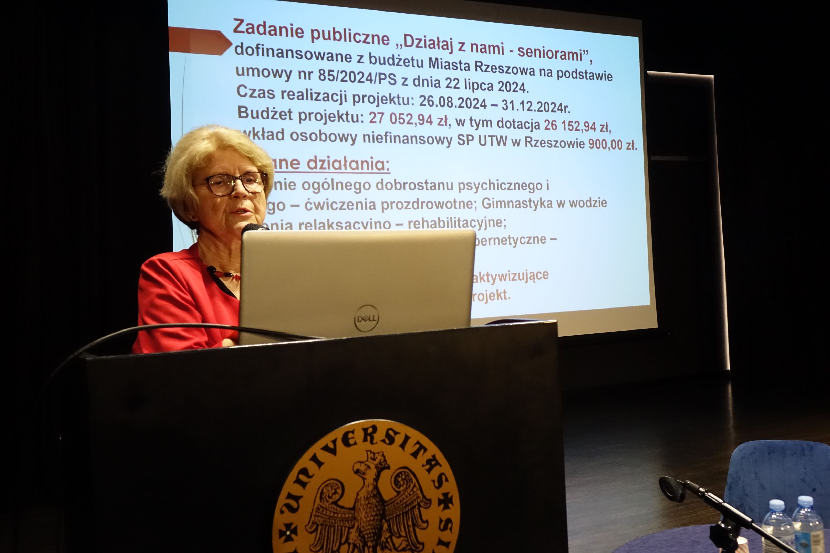 Po krótkim wystąpieniu Prezes UTW-UR kol. Danuty Kamienieckiej–Przywara, o przebiegu i wynikach projektu SP UTW „Działaj z nami - seniorami” dofinansowanego z budżetu Miasta Rzeszowa mówiła Prezes SP UTW w Rzeszowie i Wiceprezes UTW-UR kol. Maria Suchy. Główne cele projektu to: poprawa kondycji psycho–fizycznej seniorów, zmniejszenie objawów depresji i zaburzeń snu poprzez udział w ćwiczeniach; upowszechnianie i wdrożenie rozwiązań technologicznych sprzyjających włączeniu społecznemu oraz bezpiecznemu funkcjonowaniu osób starszych poprzez udział w warsztatach z zakresu cyberbezpieczeństwa;  zachęcenie osób starszych do aktywnego spędzania czasu wolnego i podnoszenia swojej sprawności poprzez udział w ćwiczeniach rehabilitacyjnych w wodzie; zwiększenie udziału osób starszych w aktywnych formach spędzania czasu wolnego, budowanie relacji międzyludzkich. Te cele realizowane były poprzez  4 różne działania, zaplanowane dla 64 uczestników: zwiększenie ogólnego dobrostanu psychicznego i fizycznego – ćwiczenia prozdrowotne dla 2 grup dziesięcioosobowych; gimnastyka w wodzie – ćwiczenia relaksacyjno–rehabilitacyjne dla 2 grup dwunastoosobowych; bezpieczeństwo technologiczno–cybernetyczne – warsztaty dla 2 grup dziesięcioosobowych; spotkanie integracyjno-aktywizujące podsumowujące projekt w dniu 10 grudnia 2024. Uczestnicy każdego z działań wypełnili ankiety ewaluacyjne, w których między innymi odpowiedzieli na pytanie, jak oceniają działania, w których mieli okazję uczestniczyć. Zdecydowana większość ankietowanych 93,7% - najwyżej (bardzo dobrze) oceniła zajęcia, w których uczestniczyli. Przekroczony został próg 90,00 % zadowolonych, deklarowany w ofercie.