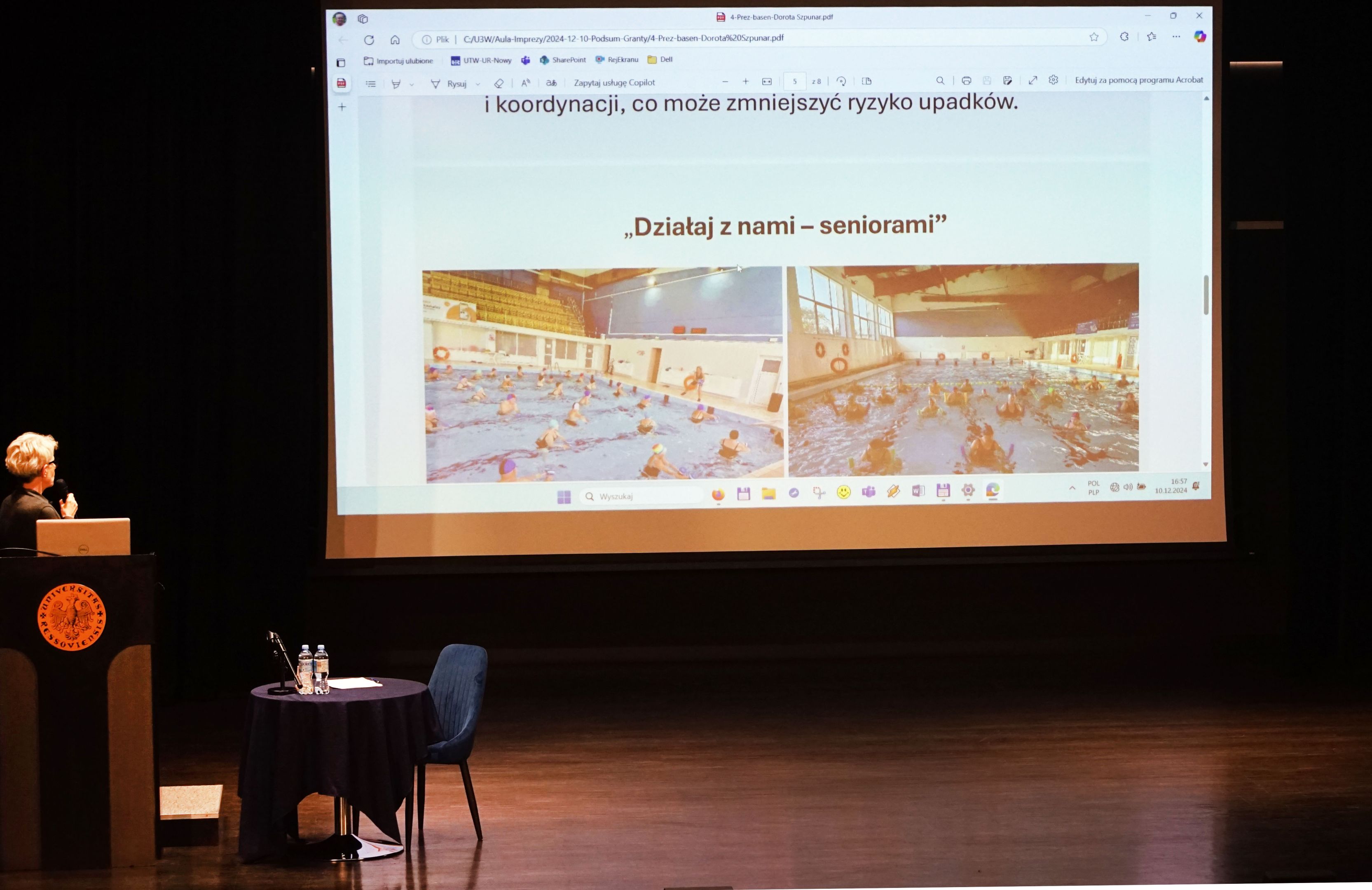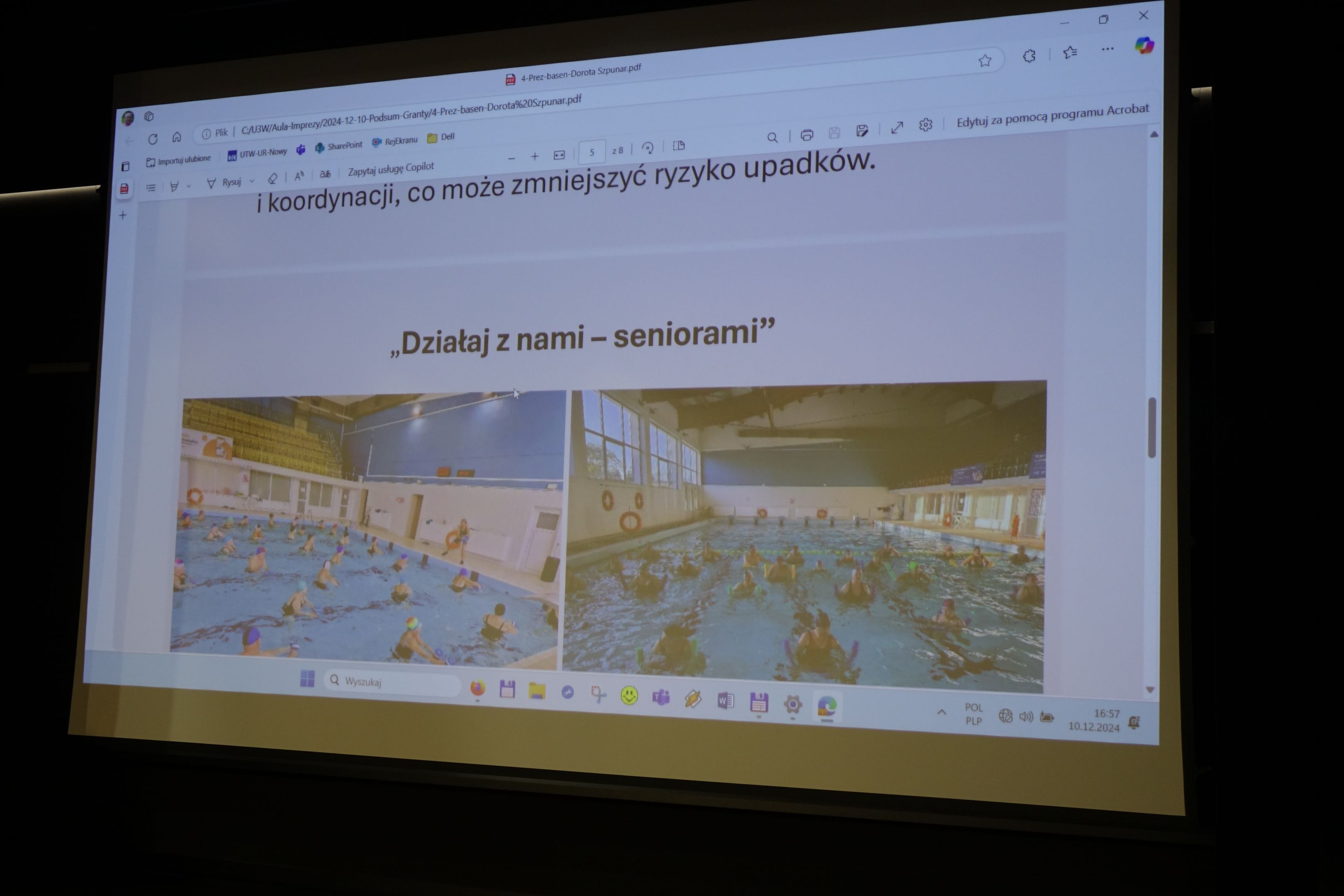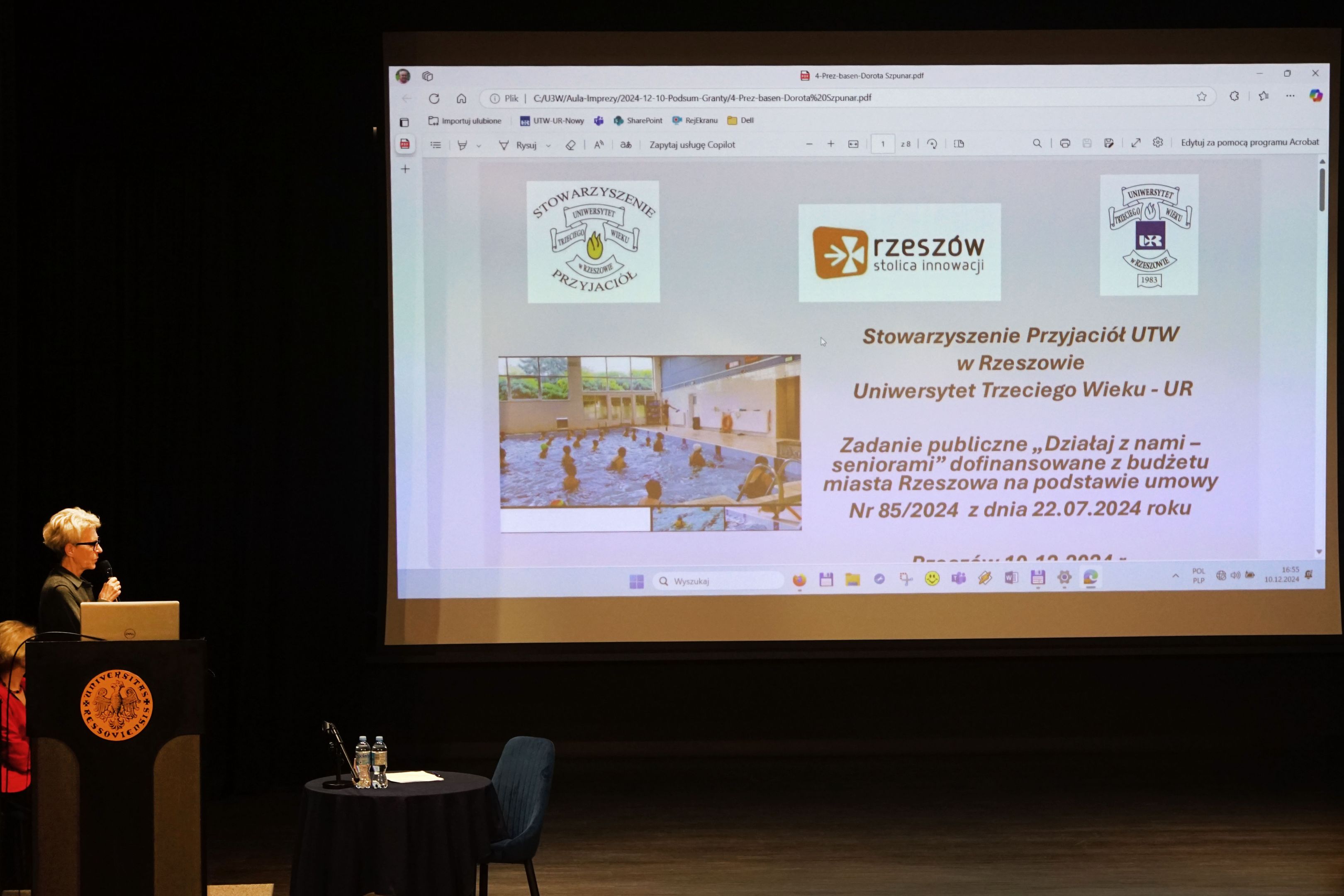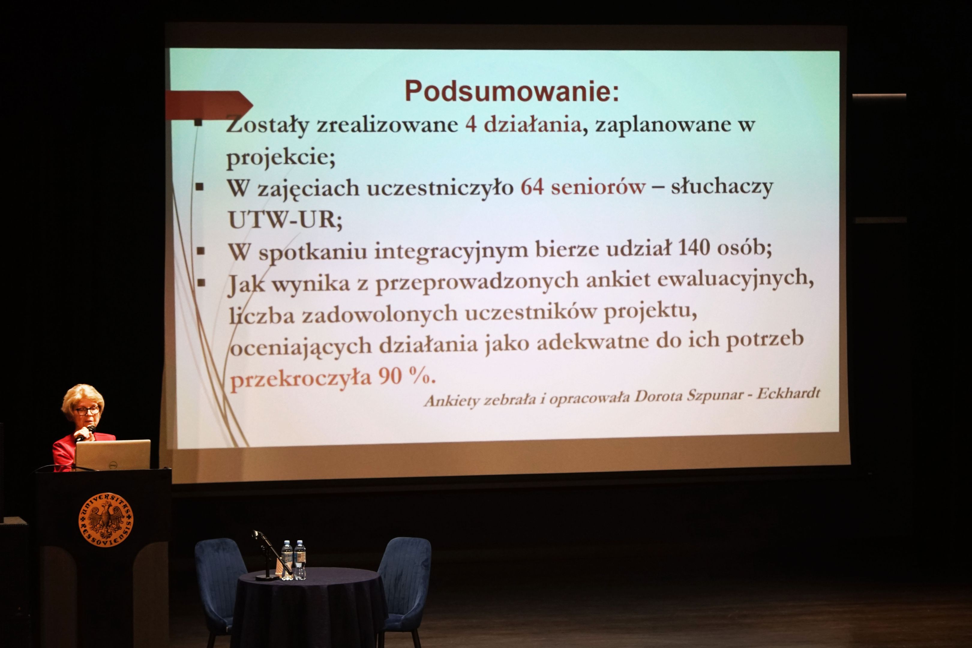 Po krótkim wystąpieniu Prezes UTW-UR kol. Danuty Kamienieckiej–Przywara, o przebiegu i wynikach projektu SP UTW „Działaj z nami - seniorami” dofinansowanego z budżetu Miasta Rzeszowa mówiła Prezes SP UTW w Rzeszowie i Wiceprezes UTW-UR kol. Maria Suchy. Główne cele projektu to: poprawa kondycji psycho–fizycznej seniorów, zmniejszenie objawów depresji i zaburzeń snu poprzez udział w ćwiczeniach; upowszechnianie i wdrożenie rozwiązań technologicznych sprzyjających włączeniu społecznemu oraz bezpiecznemu funkcjonowaniu osób starszych poprzez udział w warsztatach z zakresu cyberbezpieczeństwa;  zachęcenie osób starszych do aktywnego spędzania czasu wolnego i podnoszenia swojej sprawności poprzez udział w ćwiczeniach rehabilitacyjnych w wodzie; zwiększenie udziału osób starszych w aktywnych formach spędzania czasu wolnego, budowanie relacji międzyludzkich. Te cele realizowane były poprzez  4 różne działania, zaplanowane dla 64 uczestników: zwiększenie ogólnego dobrostanu psychicznego i fizycznego – ćwiczenia prozdrowotne dla 2 grup dziesięcioosobowych; gimnastyka w wodzie – ćwiczenia relaksacyjno–rehabilitacyjne dla 2 grup dwunastoosobowych; bezpieczeństwo technologiczno–cybernetyczne – warsztaty dla 2 grup dziesięcioosobowych; spotkanie integracyjno-aktywizujące podsumowujące projekt w dniu 10 grudnia 2024. Uczestnicy każdego z działań wypełnili ankiety ewaluacyjne, w których między innymi odpowiedzieli na pytanie, jak oceniają działania, w których mieli okazję uczestniczyć. Zdecydowana większość ankietowanych 93,7% - najwyżej (bardzo dobrze) oceniła zajęcia, w których uczestniczyli. Przekroczony został próg 90,00 % zadowolonych, deklarowany w ofercie.