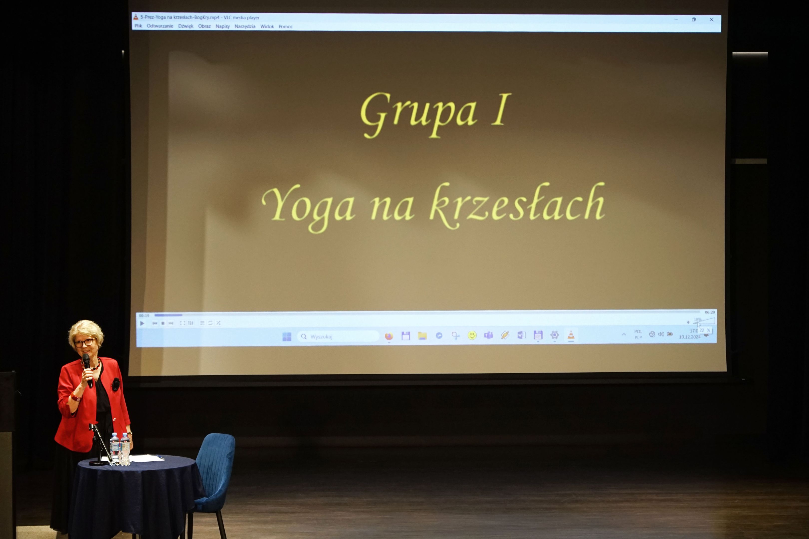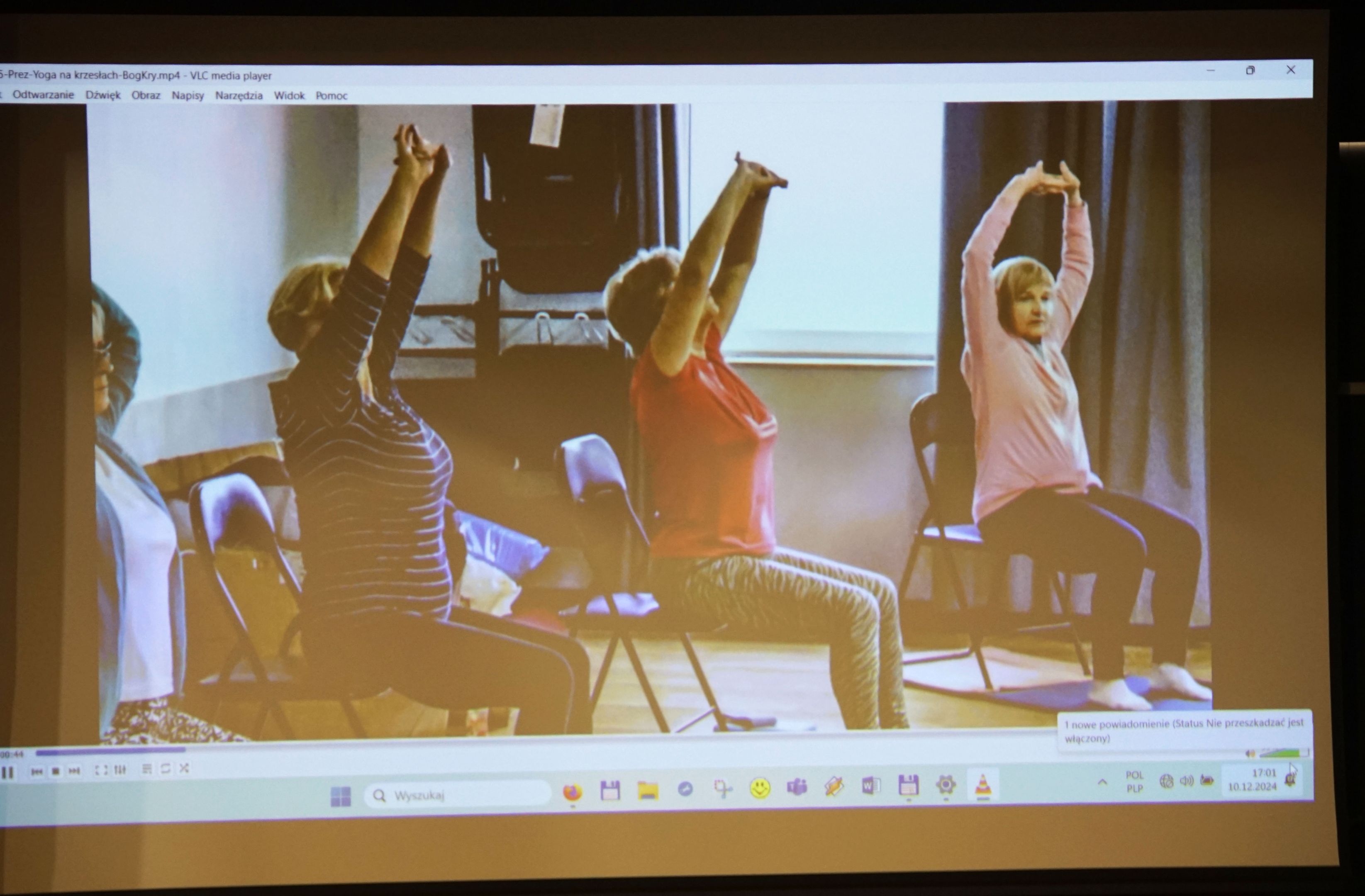 Zebrani mogli także obejrzeć dwa filmiki autorstwa kol. Emila Bisa i kol. Bogumiły Krypel: ”Yoga na krzesłach dla seniorów” oraz „Ćwiczenia równowagi ciała i dna miednicy”. Ostatnim elementem tej części spotkania była przedstawiona przez kol. Dorotę Szpunar–Eckhardt prezentacja z rehabilitacyjnych ćwiczeń w wodzie na krytym basenie ROSIR.