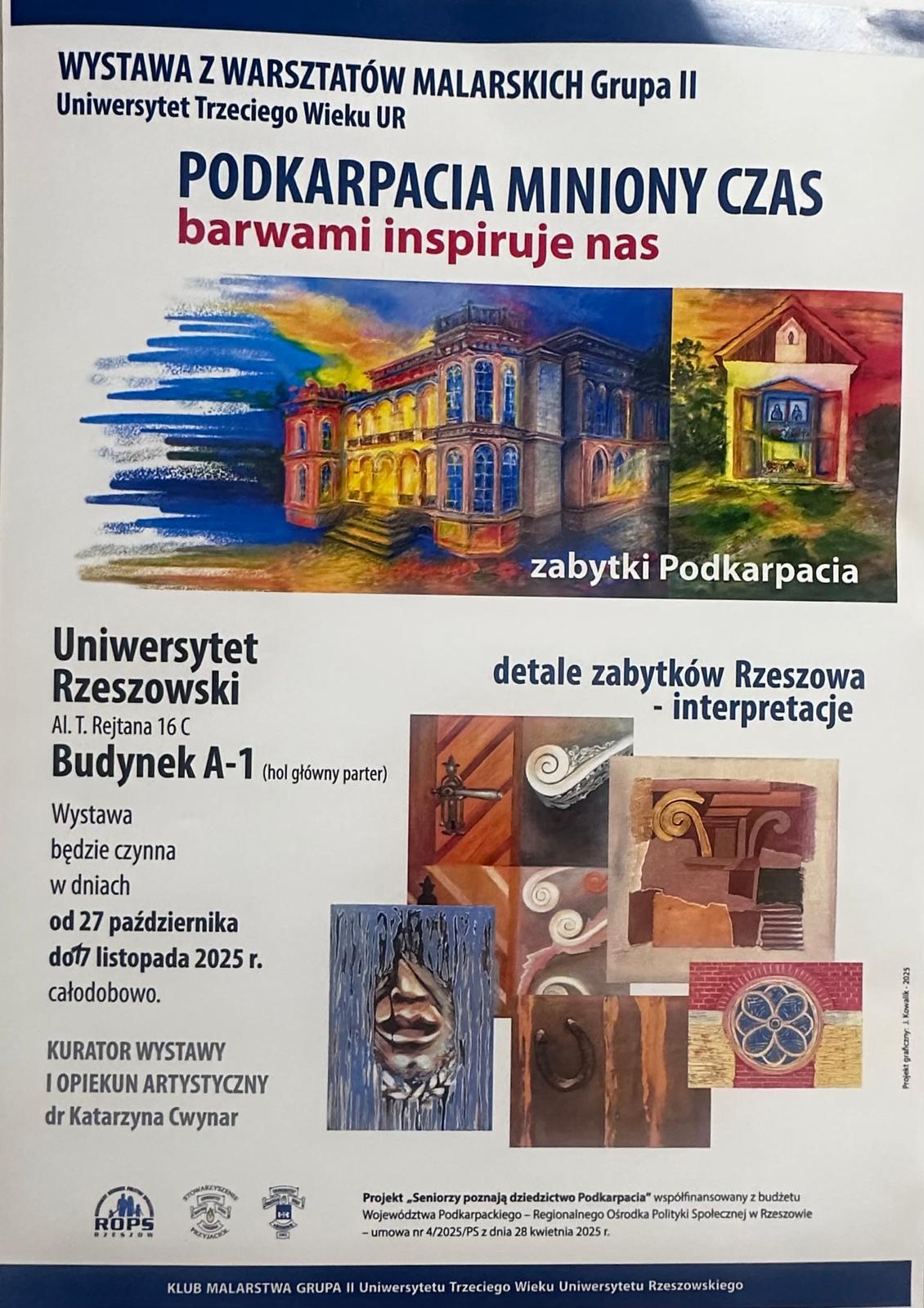 W dniach od 27.10.2025 do 17.11.2025 w holu głównym bud.A-1 Uniwersytetu Rzeszowskiego przy ul. Al. T. Rejtana 16 C odbyła się WYSTAWA MALARSTWA GRUPY II na zakończenie warsztatów w ramach projektu " SENIORZY POZNAJĄ DZIEDZICTWO PODKARPACIA".