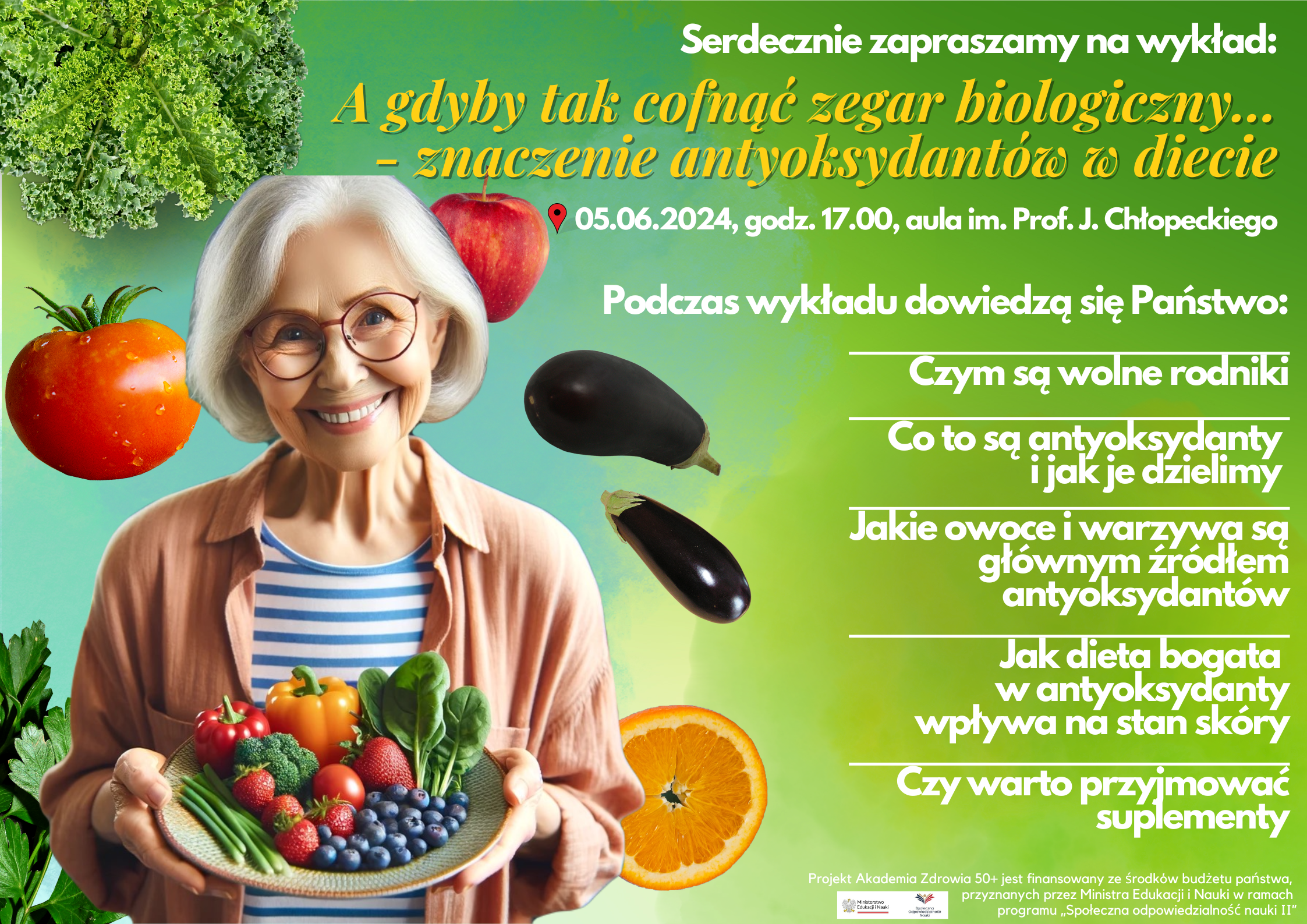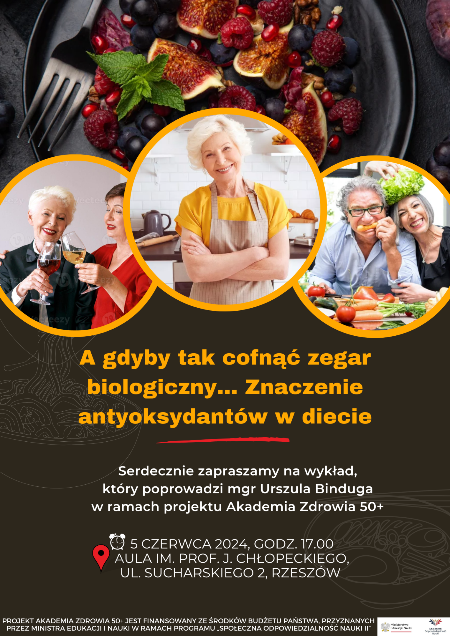Serdecznie zapraszamy na wiosenny wykład w ramach projektu Akademia Zdrowia 50+ pt. „A gdyby tak cofnąć zegar biologiczny… - znaczenie antyoksydantów w diecie”, który odbędzie się 05.06.2024 r. o godzinie 17.00 w auli głównej im. prof. Jerzego Chłopeckiego w Wyższej Szkole Informatyki i Zarządzania w Rzeszowie.