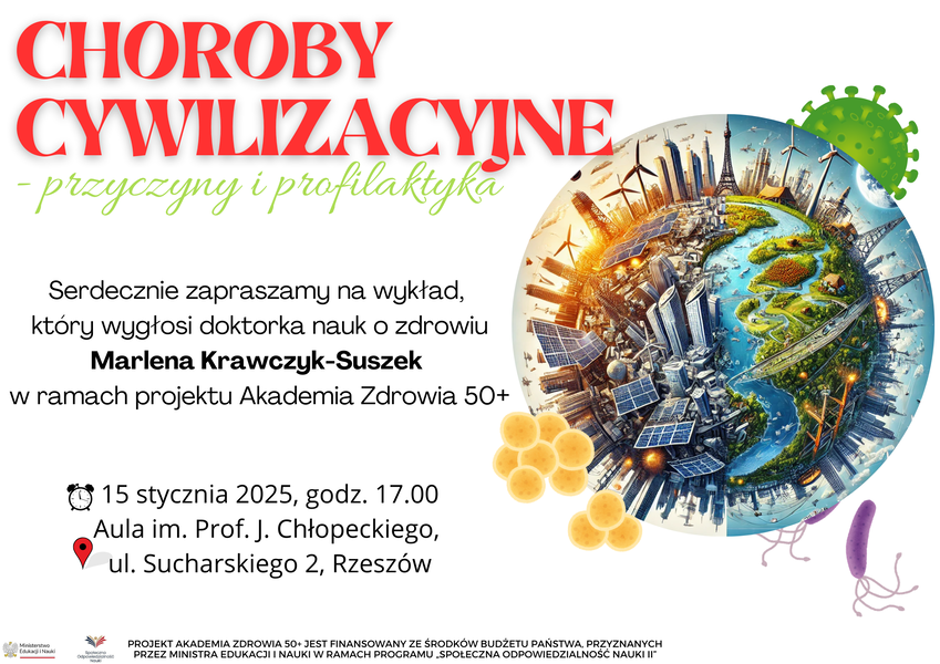 Wszystkiego najlepszego w Nowym Roku! Wraz z jego rozpoczęciem zachęcamy do podjęcia refleksji nad postępem cywilizacyjnym i kwestiami zdrowotnymi. W tym celu serdecznie zapraszamy na najnowszy wykład w ramach projektu Akademia Zdrowia 50+! Spotkanie pt. „Choroby cywilizacyjne – przyczyny i profilaktyka” odbędzie się 15.01.2025 r. o godzinie 17.00 w auli głównej im. prof. Jerzego Chłopeckiego w Wyższej Szkole Informatyki i Zarządzania w Rzeszowie.