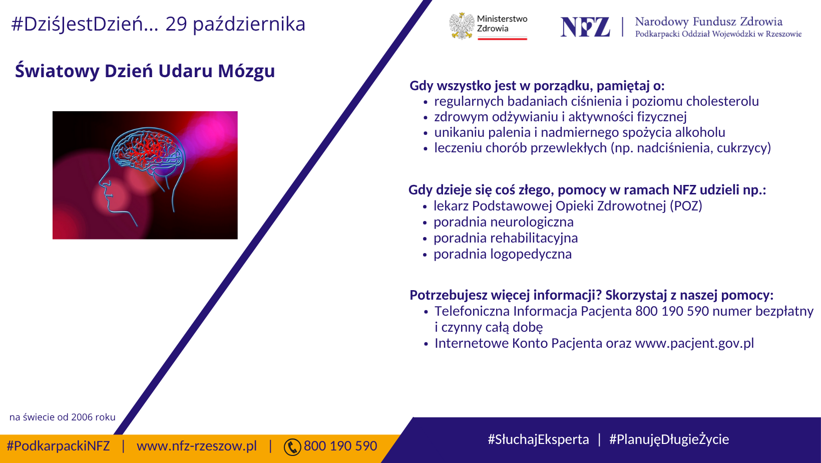 Info NFZ: 29 października to Światowy Dzień Udaru Mózgu.