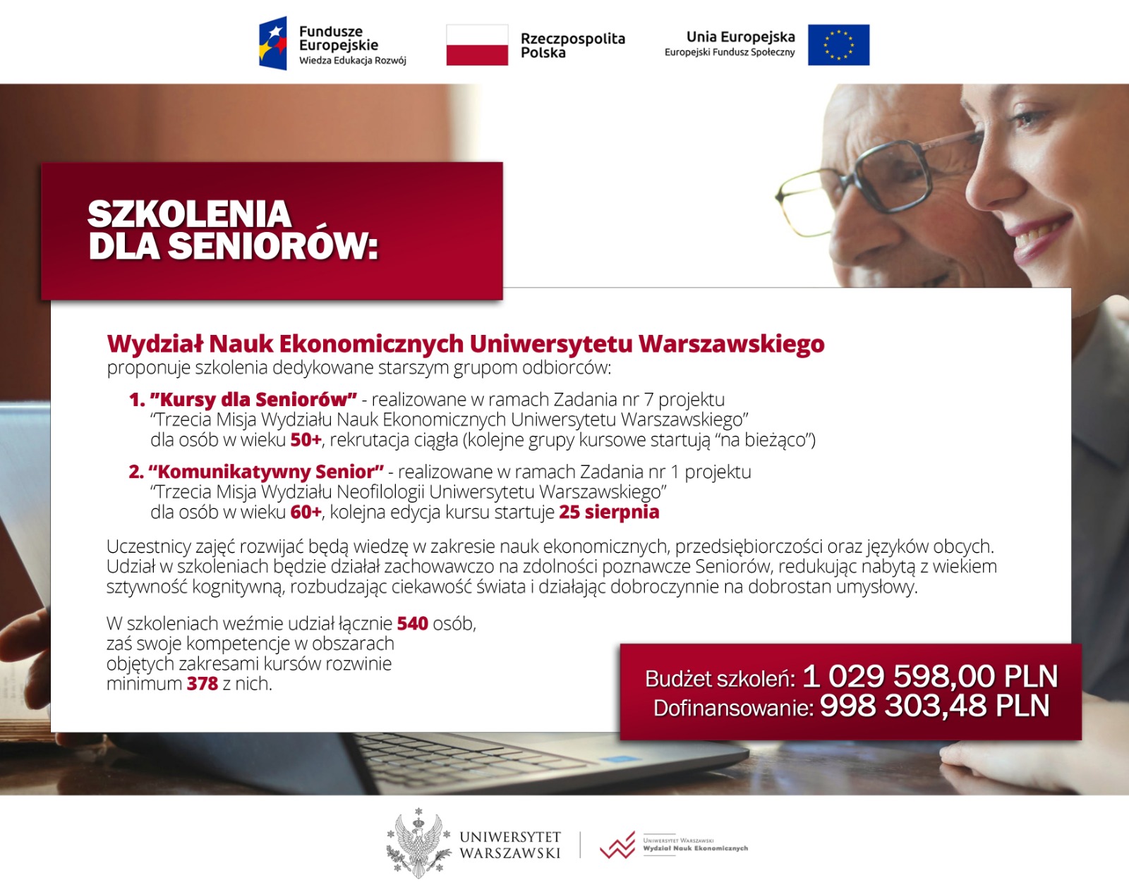 2. Drugie z proponowanych szkoleń „Kursy dla seniorów” ma na celu aktywizację seniorów z całej Polski (w wieku 50+) z wykorzystaniem opracowanego programu kształcenia w zakresie nauk ekonomicznych i przedsiębiorczości. Organizowane zajęcia będą miały charakter spotkań tematycznych, poświęconych różnym zagadnieniom ekonomicznym i psychologicznym. Każde spotkanie będzie trwać 1,5 godziny. Na zajęciach omawiane są m.in. następujące tematy: