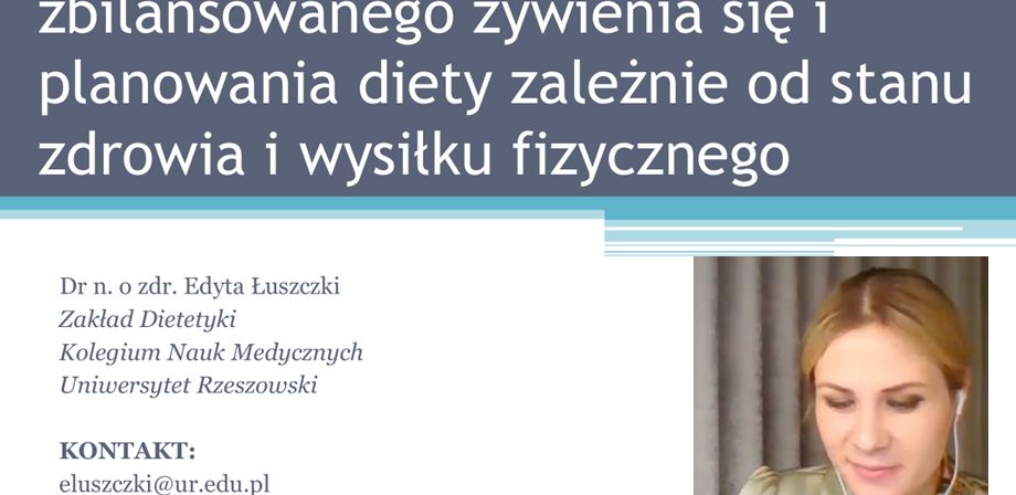 W ramach kursu "Zdrowy styl życia" wysłuchaliśmy zdalnie ciekawego wykładu na temat zasad dietetyki: "Jesteś tym co jesz - zasady zbilansowanego żywienia", 10.02.2021, dr n.o zdr. Edyty Łuszczki z Zakładu Dietetyki Kolegium Nauk Medycznych UR, która w swej pracy naukowej prowadzi badania na temat żywienia dzieci i młodzieży, a także osób dorosłych. Czynnie pracuje również jako dietetyk. Bierze udział w międzynarodowych konferencjach, jest członkiem krajowych i zagranicznych organizacji naukowych i wiele publikuje.