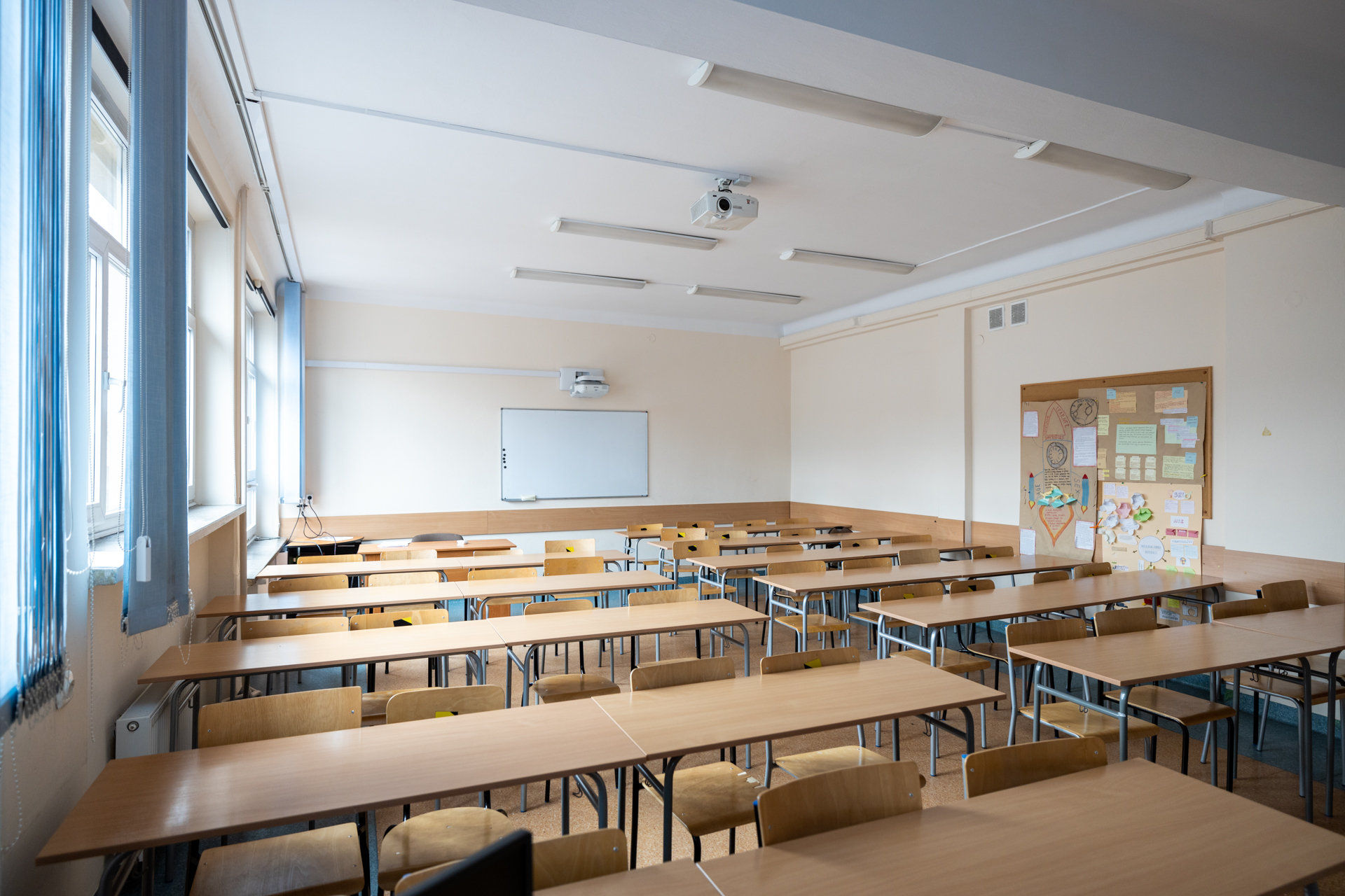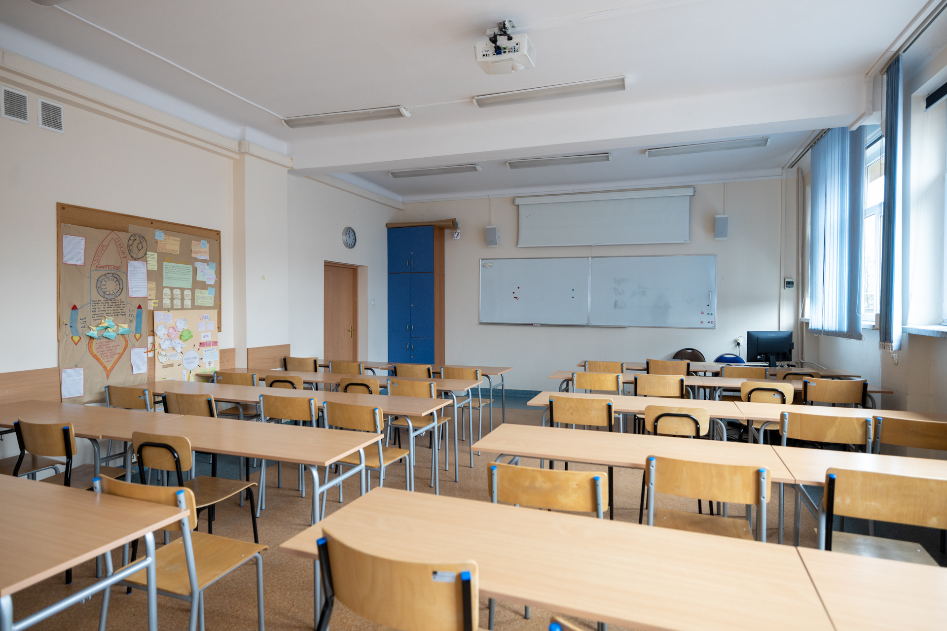 - projektor multimedialny i ekran, tablica do pisania pisakami
