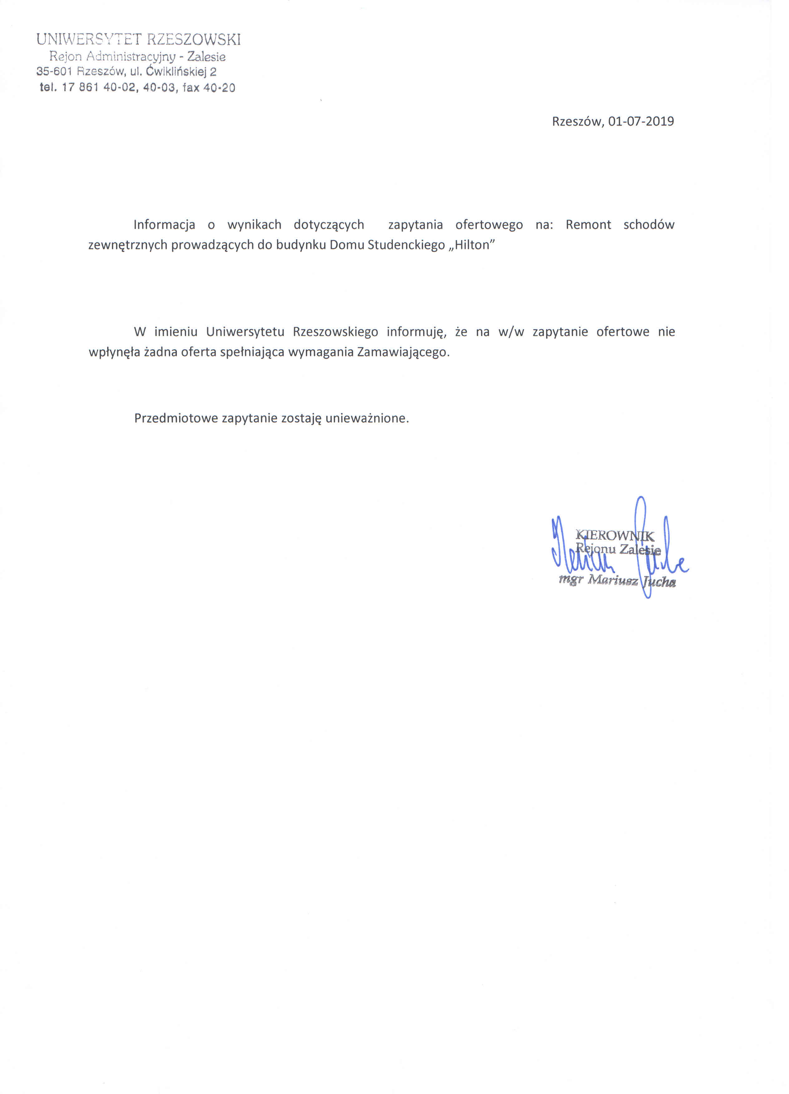 zobacz więcej Informacja o wyborze najkorzystniejszej oferty z zapytania ofertowego nr ZAK/2019/01/00237