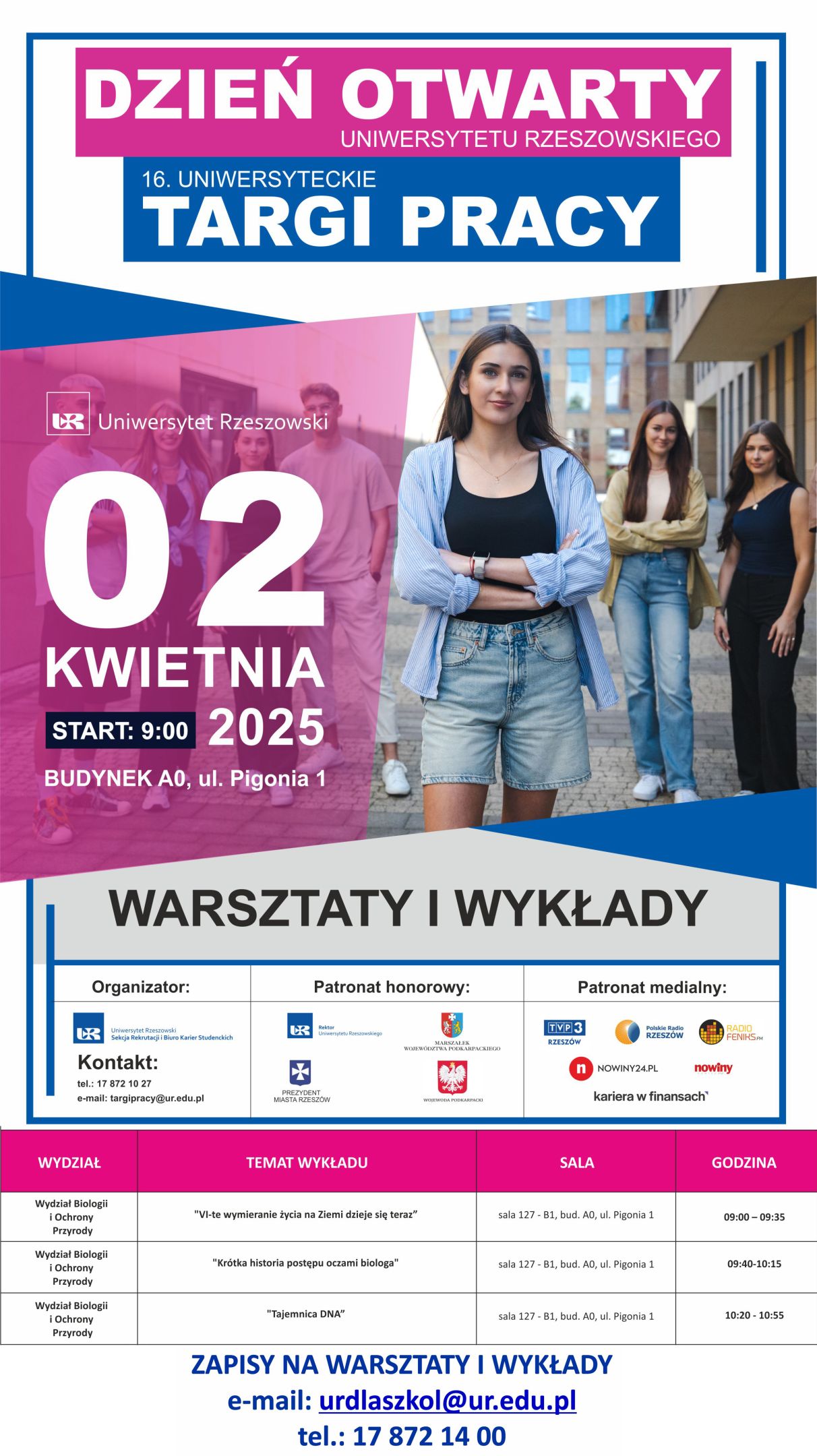 Zapraszamy na Dni Otwarte Uniwersytetu Rzeszowskiego, podczas których pracownicy Wydziału Biologii i Ochrony Przyrody przygotowali dla Was nie tylko trzy fascynujące wykłady, ale także własne stanowisko, gdzie będziecie mogli porozmawiać z wykładowcami i studentami, zobaczyć ciekawostki biologiczne i poznać ofertę studiów!