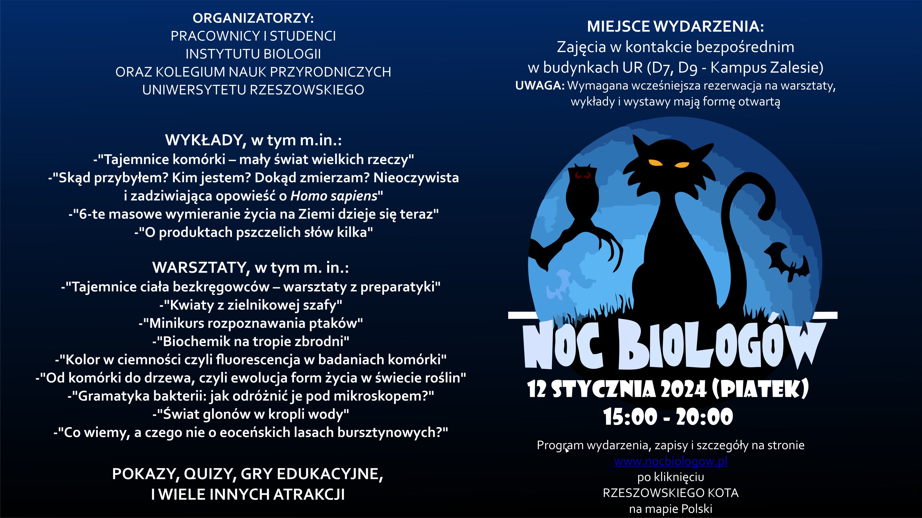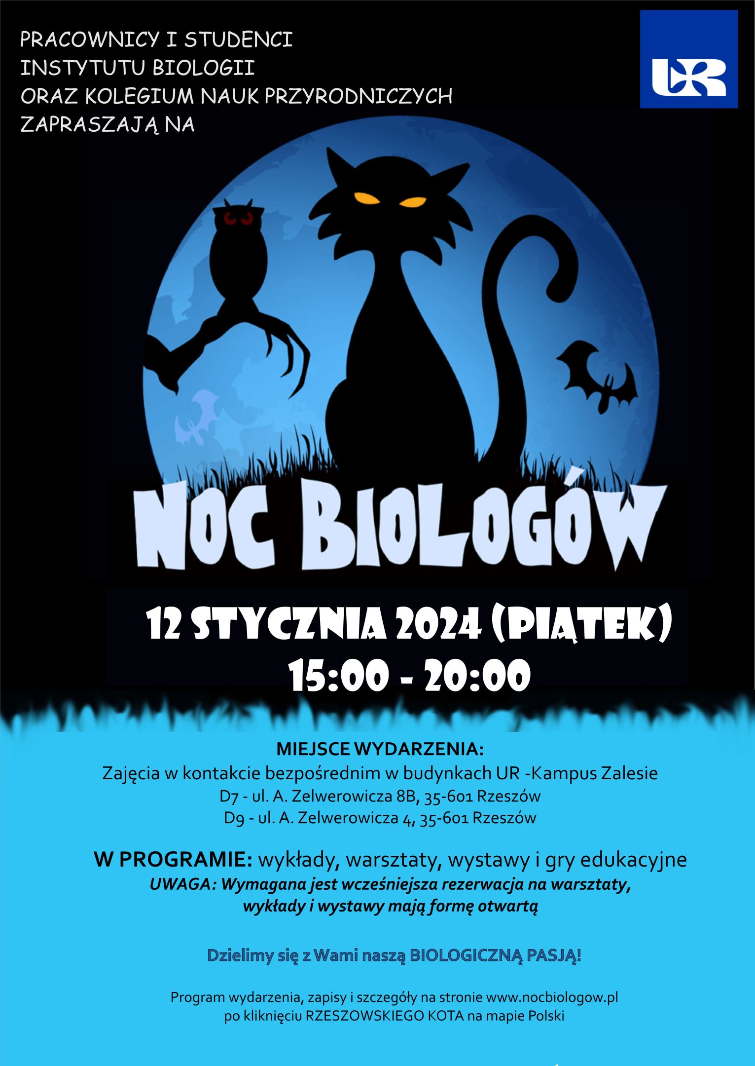 12 stycznia 2024 r. (piątek) w godz. 15:00- 20:00 odbędzie się ósma edycja Nocy Biologów w Rzeszowie. Pracownicy i studenci Instytutu Biologii oraz pracownicy Kolegium Nauk Przyrodniczych Uniwersytetu Rzeszowskiego zapraszają do uczestnictwa w akcji.