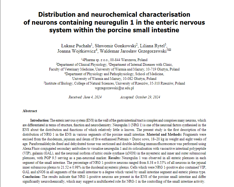 Uprzejmie informujemy, że dzięki współpracy naszego Instytutu Biologii (dr hab. n wet. Waldemar Grzegorzewski jako współautor korespondencyjny i współwykonawca) z Wydziałem Lekarskim oraz Wydziałem Medycyny Weterynaryjnej UWM Olsztyn, ukazała się publikacja w Journal of Veterinary Research Distribution and neurochemical characterisation of neurons... (140 pkt ministerialnych , IF 1.3;) gdzie po raz pierwszy opisano role neuroreguliny (NRG 1) w neuronach jelitowych w jelicie cienkim świni. Wyniki niniejszego badania jednoznacznie wykazały, że NRG 1 często występuje w neuronach jelitowych zlokalizowanych w ścianie jelita cienkiego świni, co sugeruje, że substancja ta jest ważnym regulatorem funkcji badanych odcinków przewodu pokarmowego i wymaga dalszych poszerzonych badań. Neurony zawierające NRG 1 były rozmieszczone we wszystkich typach splotów jelitowych, co mogło wskazywać, że kontroluje on funkcję jelit w różnych mechanizmach. Co ciekawe, że Neuregulina 1-dodatnia w neuronach jelitowych zawierała również różne inne czynniki neuronalne, w tym GAL, VIP i nNOS, co wskazywało na udział NRG 1 w różnych procesach regulacyjnych w jelicie cienkim. Kolokalizacja NRG 1 z GAL, VIP i/lub nNOS w tych samych komórkach neuronalnych sugeruje, że substancje te mogą odgrywać podobne role. Jednak wiele aspektów funkcji NRG 1 w jelicie cienkim pozostaje w sferze domysłów, a ich szczegółowe wyjaśnienia wymagają dalszych kompleksowych badań.