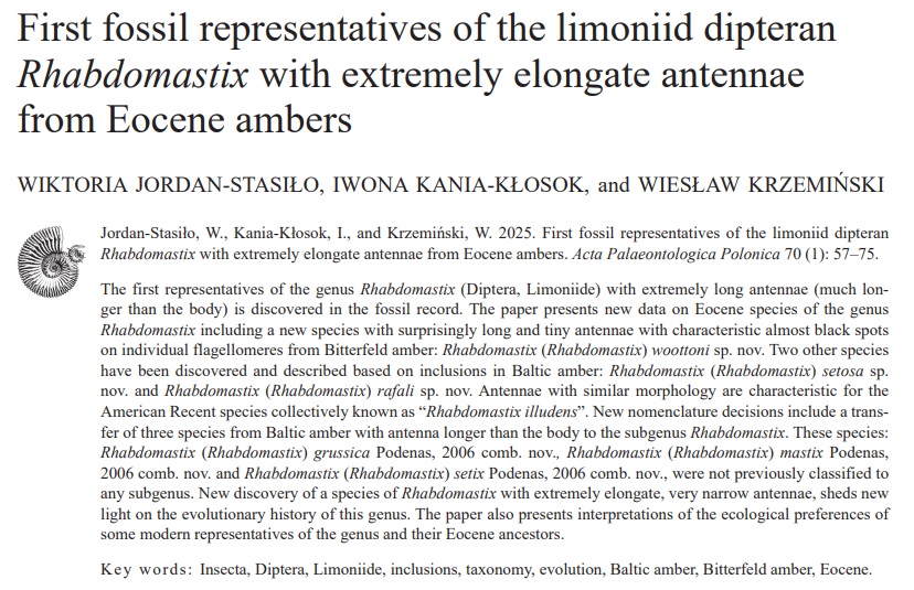 Trzy nowe dla nauki gatunki z rodzaju Rhabdomastix Skuse, 1890 zachowane w eoceńskich żywicach kopalnych zostało opisanych przez pracowników naszego Wydziału: dr Wiktorię Jordan-Stasiło i prof. dr hab. Iwonę Kanię – Kłosok przy współpracy prof. dr hab. Wiesława Krzemińskiego z ISEZ PAN w Krakowie. Dodatkowo zmieniona została pozycja taksonomiczna kilku znanych już gatunku opisanych z bursztynu bałtyckiego.