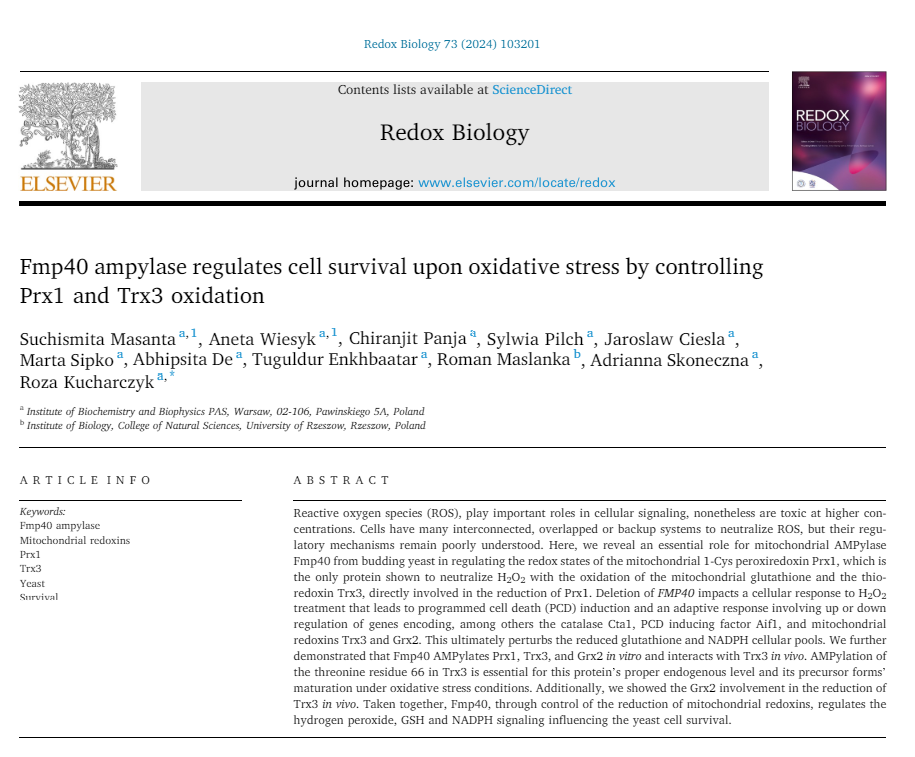 Jest nam niezmiernie miło poinformować, że w prestiżowym czasopiśmie Redox Biology (IF=11,4; 140 pkt MNiSW) ukazał się artykuł, którego współautorem jest pracownik naukowy Instytutu Biologii UR dr inż. Roman Maślanka. Publikacja pt. „Fmp40 ampylase regulates cell survival upon oxidative stress by controlling Prx1 and Trx3 oxidation” powstała w ramach współpracy z zespołem prof. Róży Kucharczyk z IBB PAN w Warszawie. W pracy w kompleksowy sposób zostały przeanalizowana komórkowa rola AMPylazy Fmp40 oraz jej powiązanie z redoksynami w komórkach drożdży Saccharomyces cerevisiae. Wykazano w niej m.in. że AMPylaza Fmp40 bierze udział w kontroli redukcji mitochondrialnych redoksyn Prx1 i Trx3, przez co przyczynia się do sygnalizacji ROS podczas wzrostu zależnego od oddychania. Ponadto Fmp40 ma także związek z utrzymaniem równowagi komórkowych buforów redoks GSH i NADPH.