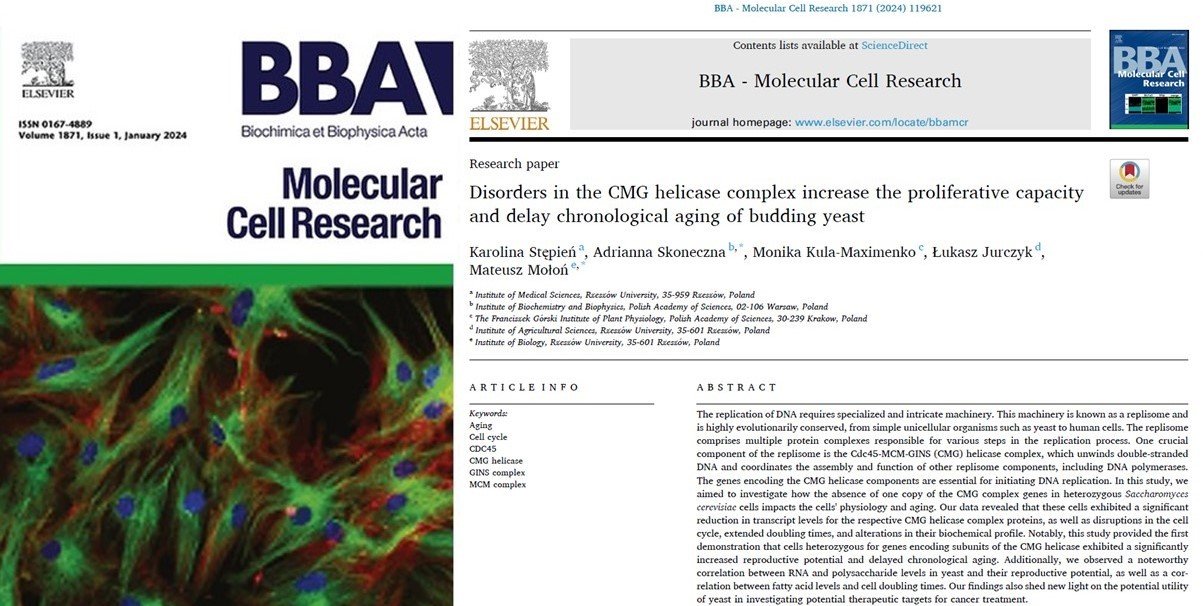 Miło nam poinformować o nowej publikacji zespołu badawczego dra hab. Mateusza Mołonia, prof. UR, pt. „Disorders in the CMG helicase complex increase the proliferative capacity and delay chronological aging of budding yeast”, która została opublikowana w prestiżowym czasopiśmie BBA-Molecular Cell Research (IF=5.1; 140 pkt MNiSW).