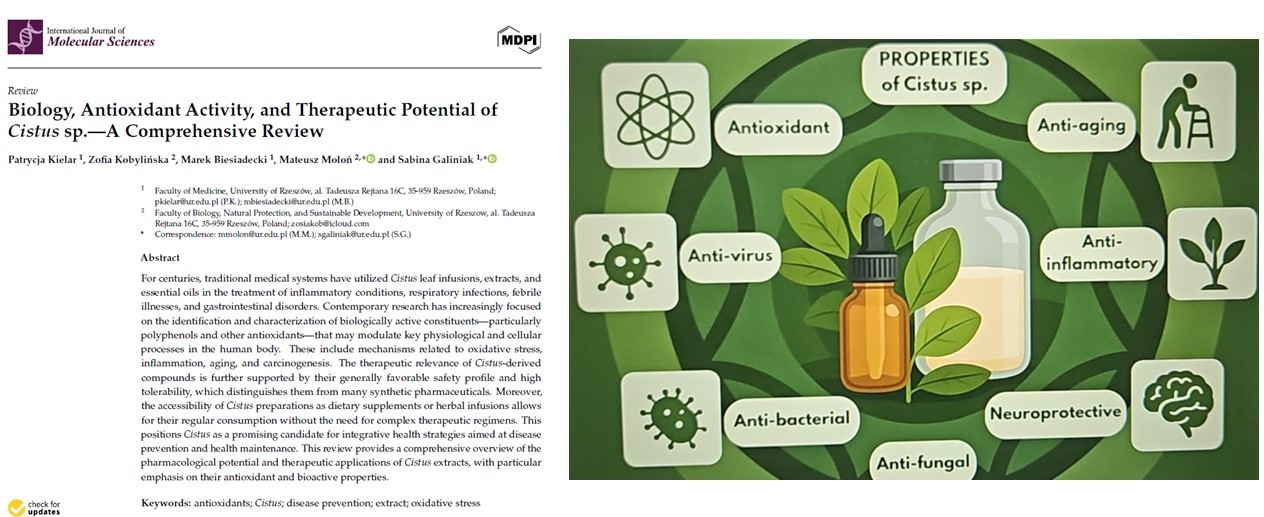 Miło nam poinformować, że zespół badawczy pod kierunkiem dra hab. Mateusza Mołonia, prof. UR, opublikował pracę pt. „Biology, Antioxidant Activity, and Therapeutic Potential of Cistus sp.—A Comprehensive Review” w czasopiśmie International Journal of Molecular Sciences (IF = 4,9; 140 pkt MNiSW).