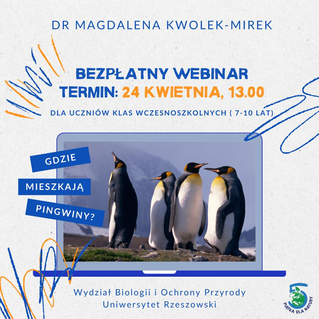 Z ogromną przyjemnością zapraszamy na wyjątkowy webinar pt. „Gdzie mieszkają pingwiny?”, który poprowadzi dr Magdalena Kwolek Mirek z Wydziału Biologii i Ochrony Przyrody Uniwersytetu Rzeszowskiego.