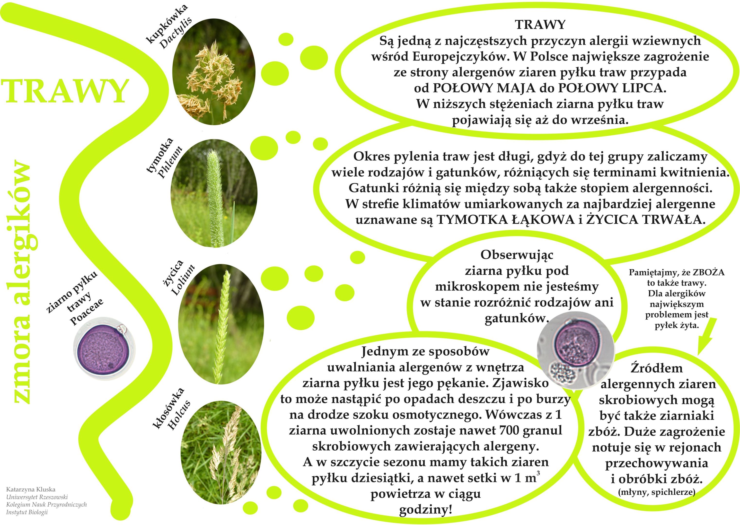 Warto wiedzieć. Jeśli obserwujesz wzmożone objawy alergii (kichanie, łzawienie oczu, duszności) podczas koszenia trawy lub żniw niekoniecznie musi oznaczać to, że jesteś uczulony na ziarna pyłku TRAW. Alergię mogą powodować obecne w trawie/zbożu zarodniki grzybów ALTERNARIA i CLADOSPORIUM, które podczas tych czynności wzbijane są w powietrze w dużych ilościach.