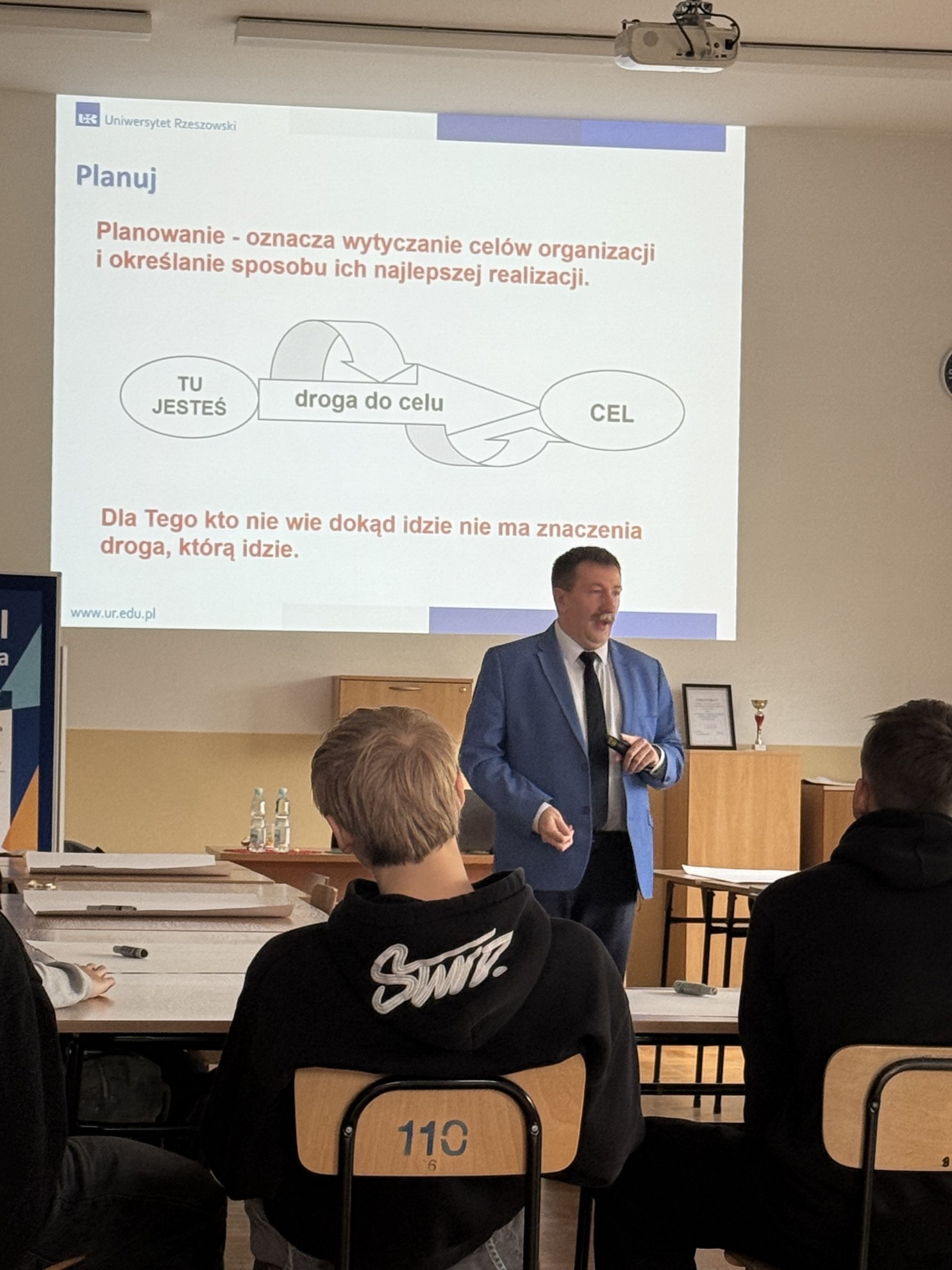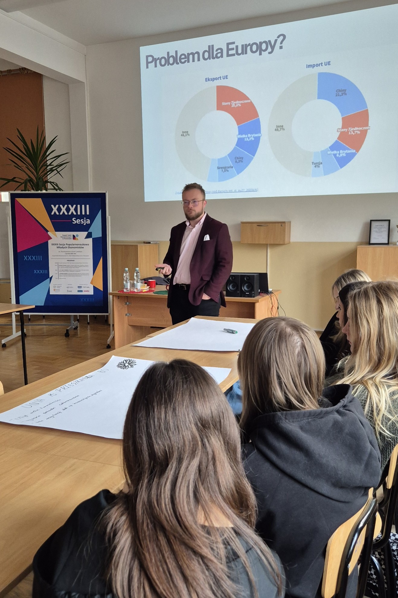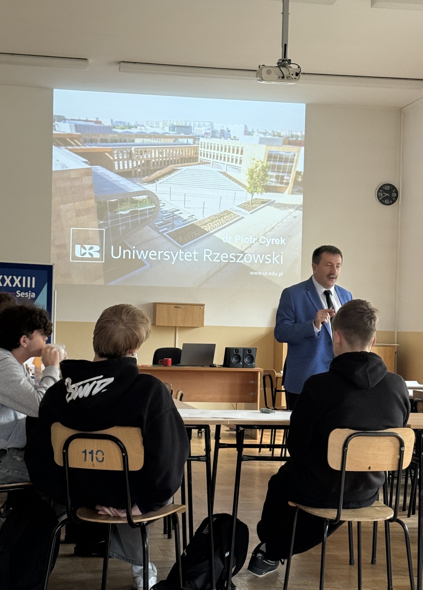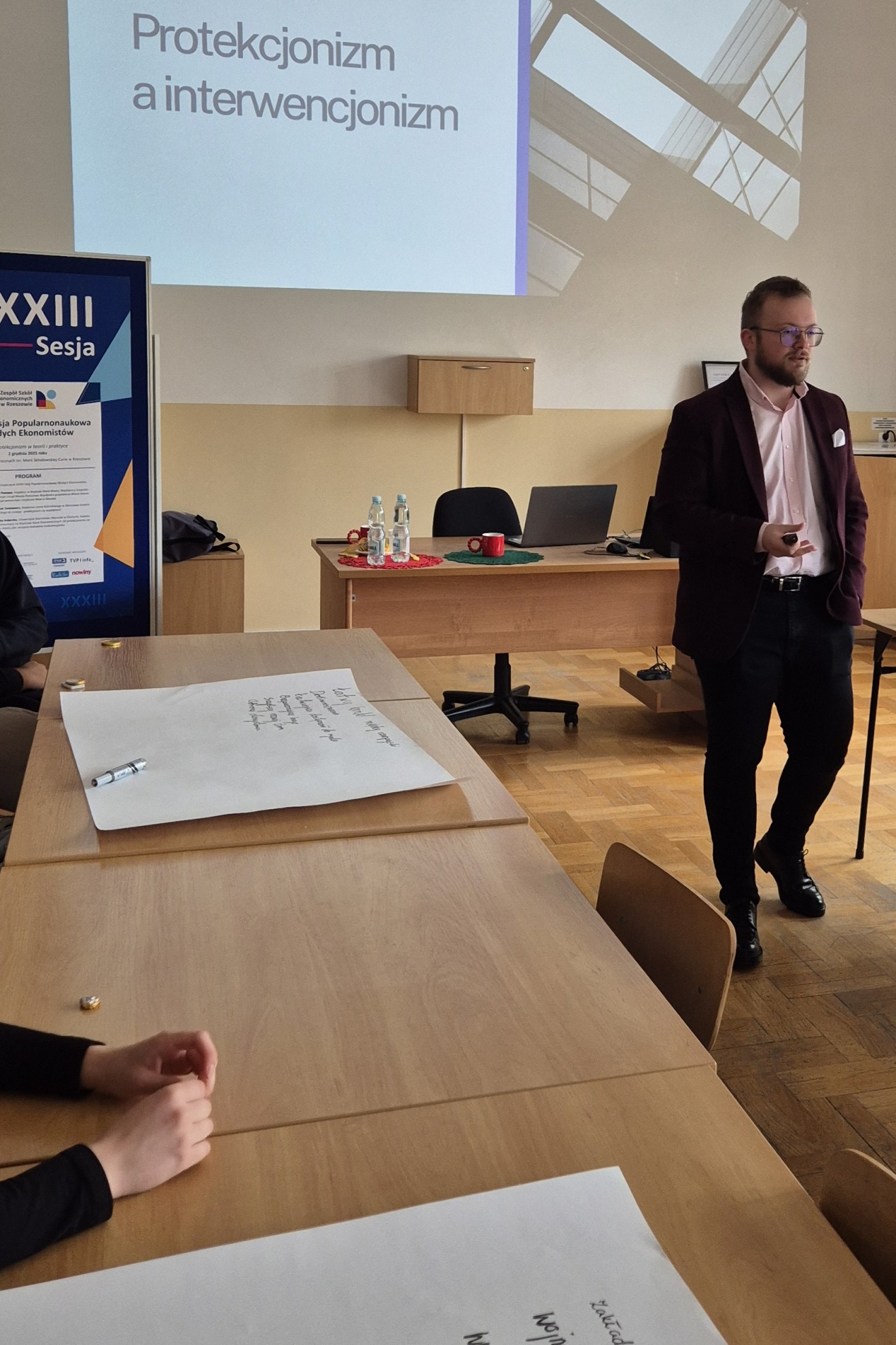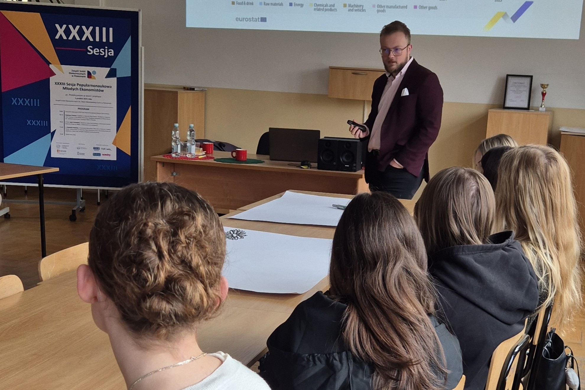 2 grudnia 2025 r. w Zespole Szkół Ekonomicznych im. Marii Skłodowskiej-Curie w Rzeszowie odbyła się XXXIII Sesja Popularnonaukowa Młodych Ekonomistów pt. Protekcjonizm w teorii i praktyce. W związku z tym wydarzeniem pracownicy Wydziału Ekonomii i Finansów UR - doktor Piotr Cyrek i magister Hubert Leśniak przygotowali warsztaty dla uczniów szkoły.