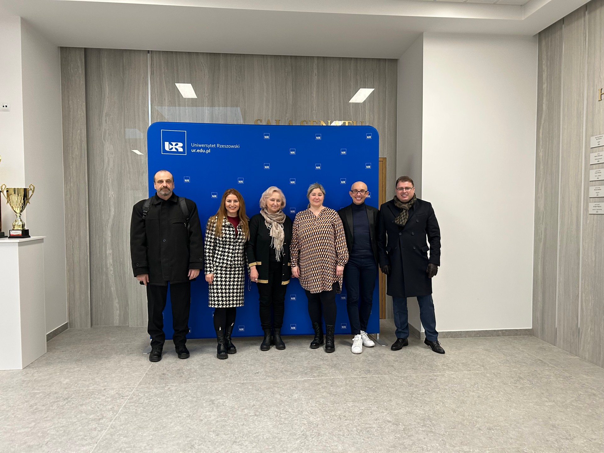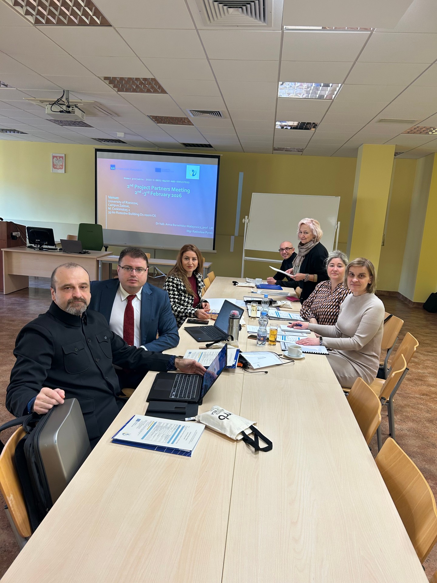 W dniu 2 lutego 2026 roku na Wydziale Ekonomii i Finansów Uniwersytetu Rzeszowskiego odbyło się drugie spotkanie partnerów w ramach międzynarodowego projektu EIUS – European Inclusion of Ukrainian Students (nr projektu 2023-1-SK01-KA220-HED-000157553). Konsorcjum składa się z przedstawicieli uczelni ze Słowacji – lider projektu, Polski i Rumunii. Spotkanie zostało zorganizowane przez zespół projektowy w składzie dr hab. Anna Barwińska-Małajowicz, prof. UR, mgr Radosław Pyrek oraz mgr Natalia Kłos. W spotkaniu wzięli udział doc. Mgr. Ing. Miroslava Knapková, PhD i Zuzana Kvetková z Univerzita Mateja Bela oraz PhD Maria Alina Carataș, PhD Tanase Tasente, Associate Professor Cristian Opariuc-Dan PhD z Universitatea Ovidius din Constanta z Ruminii.