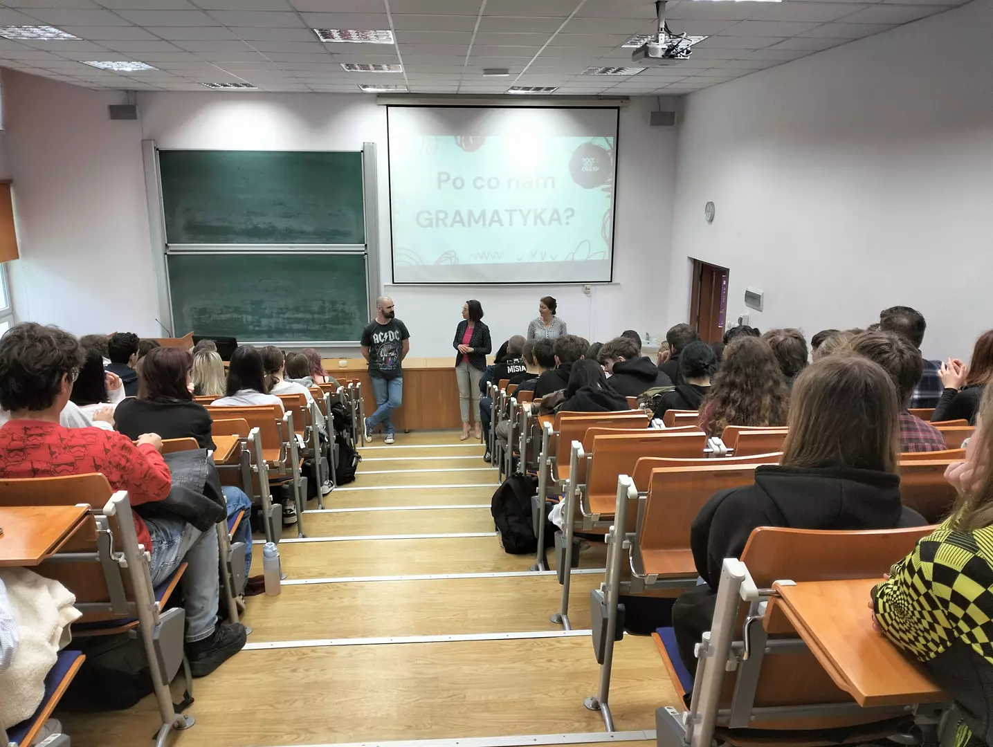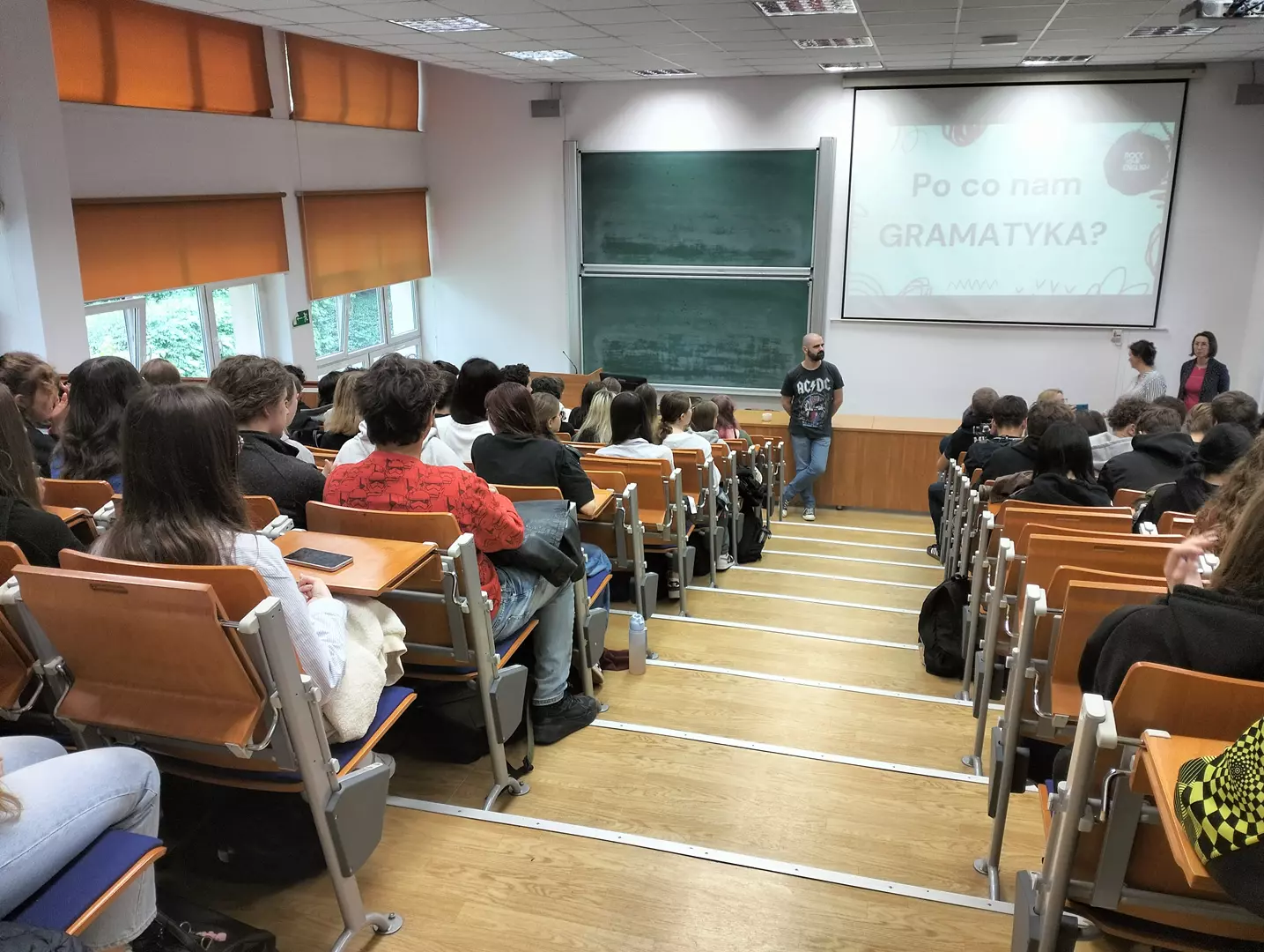 23 maja 2025 roku Instytut Anglistyki Uniwersytetu Rzeszowskiego miał przyjemność gościć swojego absolwenta – pana Pawła Grabiasa, twórcę popularnego kanału edukacyjnego na YouTube Rock your English, poświęconego nauce języka angielskiego. Wydarzenie zainaugurowała Pani Prodziekan ds. studenckich, dr Bożena Duda, podkreślając rangę spotkania swoją obecnością. Program obejmował dwa bloki: pierwszy, adresowany do uczniów zaprzyjaźnionych rzeszowskich liceów – IV oraz VI Liceum Ogólnokształcącego – poświęcony był skutecznym metodom przyswajania gramatyki języka angielskiego. Drugi blok skierowany był do studentów filologii angielskiej Uniwersytetu Rzeszowskiego i dotyczył możliwości zawodowych oraz potencjalnych ścieżek kariery, jakie mogą się przed nimi otworzyć po ukończeniu studiów. Każde ze spotkań zgromadziło ponad 100 uczestników i cieszyło się ogromnym zainteresowaniem. Pasjonujące dyskusje nie miały końca, a pan Paweł Grabias nie tylko podzielił się cennymi doświadczeniami i zainspirował słuchaczy, lecz także znalazł czas na indywidualne rozmowy oraz pamiątkowe zdjęcia z uczestnikami. Serdeczne podziękowania kierujemy do dr Doroty Rut-Kluz, pomysłodawczyni i organizatorki wydarzenia, dzięki której spotkanie przebiegło w tak profesjonalnej i życzliwej atmosferze. Było to pierwsze spotkanie z planowanego cyklu, ale z pewnością nie ostatnie – już teraz z niecierpliwością czekamy na kolejne inspirujące wizyty naszych absolwentów!