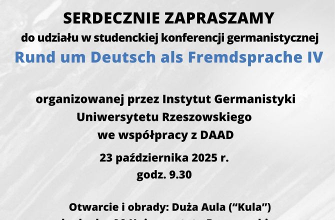 W dniu 23 października 2025 roku w Instytucie Germanistyki Uniwersytetu Rzeszowskiego odbyła się czwarta edycja Konferencji Studenckiej „Rund um Deutsch als Fremdsprache”, która już na stałe wpisała się w kalendarz wydarzeń popularnonaukowych Instytutu.