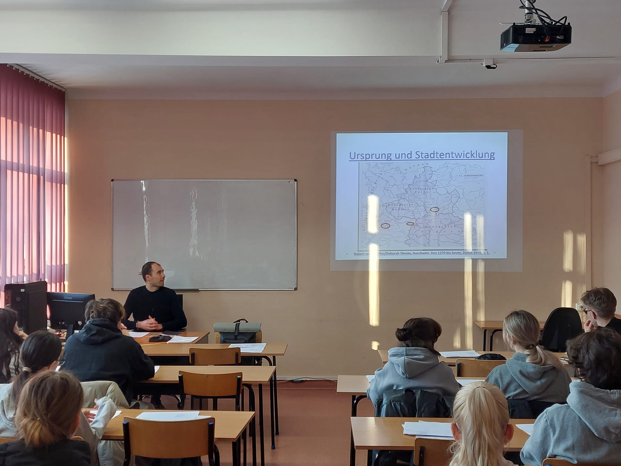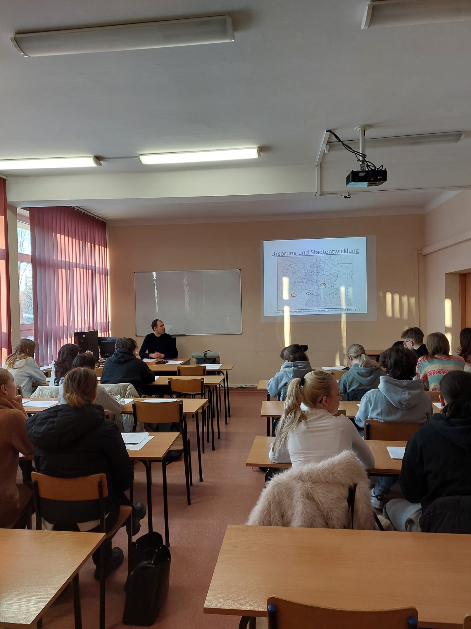 Koło Germanistów dnia 19.01.2026 miało zaszczyt gościć austriackiego literaturoznawcę Martina Riedera, który w Instytucie Germanistyki UR poprowadził wyjątkowe warsztaty poświęcone tematyce Auschwitz w ujęciu historycznym i literackim. Warsztaty zostały przygotowane i przeprowadzone przez Zuzannę Hnatio (S2 II) oraz Sylwestra Pietrykę (S2 I), pod opieką dr Bogusławy Rolek. W wydarzeniu uczestniczyli studenci I i II roku studiów stacjonarnych filologii germańskiej. Nasz gość rozpoczął spotkanie od wprowadzenia historycznego, które płynnie przechodziło w część główną warsztatów. Omówione zostały m.in. zagadnienia: Auschwitz – geneza, Auschwitz jako obóz koncentracyjny, Funkcja KL Auschwitz w III Rzeszy, Życie więźniów, Obozy koncentracyjne i zagłady, Literatura dotycząca Auschwitz.