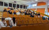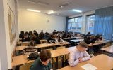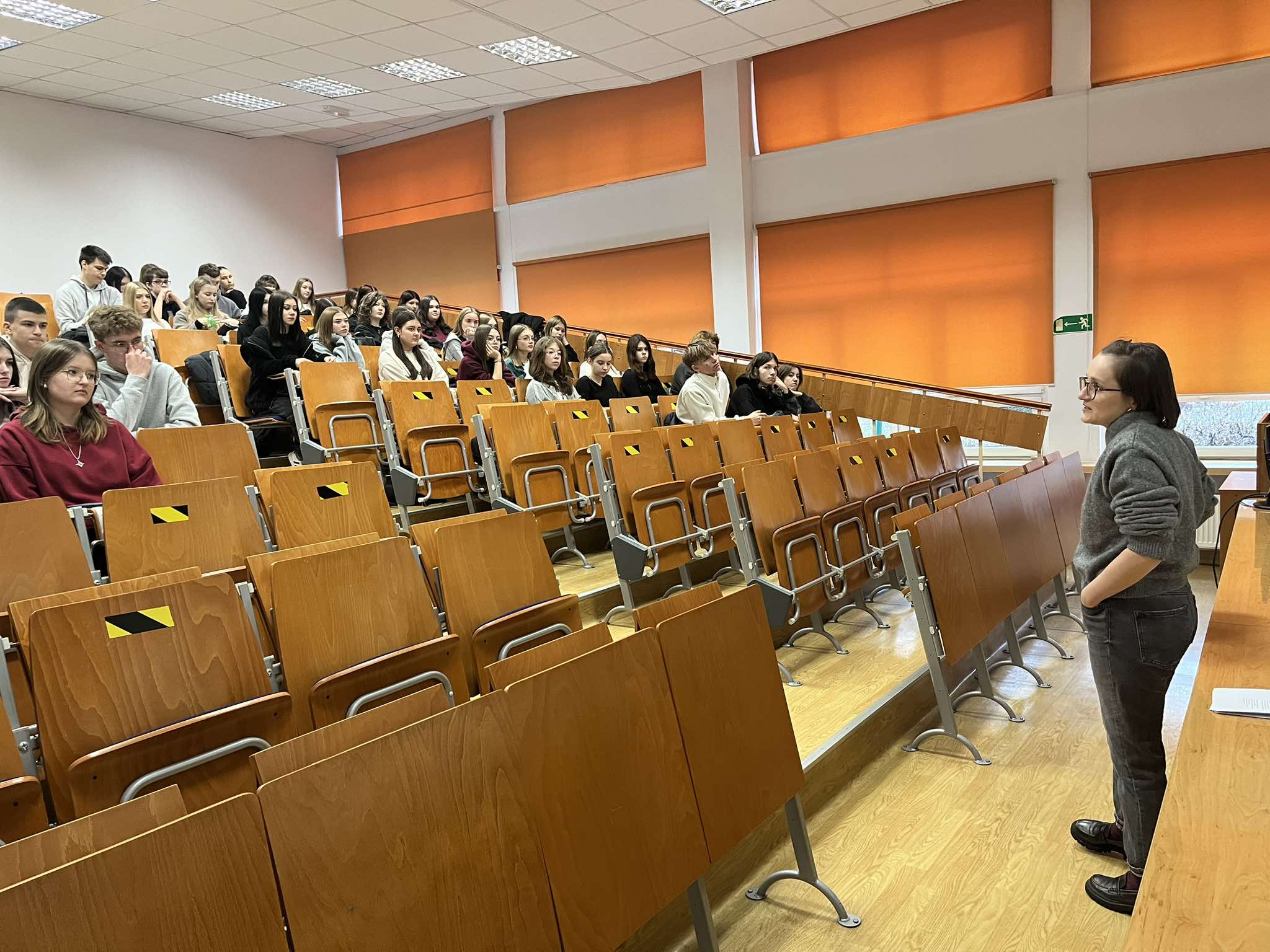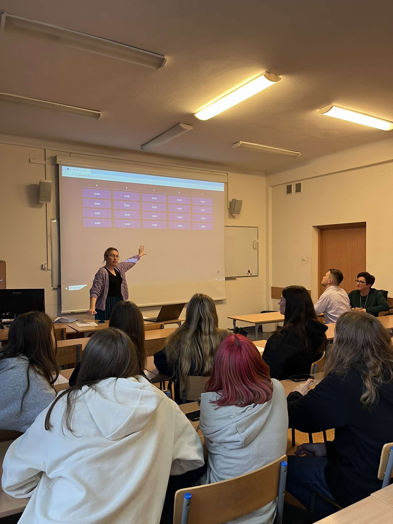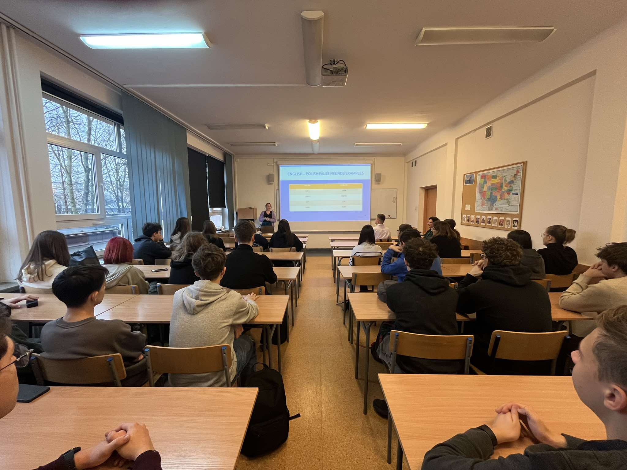 Ostatnimi warsztatami w tym roku było spotkanie z uczniami klasy dwujęzycznej IIA z I Liceum Ogólnokształcącego im. Juliusza Słowackiego w Przemyślu, którzy przybyli ze swoją nauczycielką języka angielskiego mgr Joanną Fudałą oraz nauczycielem informatyki nauczanej w j. angielskim dr. Bartoszem Buciem. Uczestnicy mieli okazję wziąć udział w warsztatach prowadzących przez dr Paulinę Mormol-Furę, która przygotowała wykład na temat false friends, czyli „fałszywych przyjaciół tłumacza”. False friends jako wyrazy w dwóch językach o podobnej lub identycznej formie lecz różnych znaczeniach stanowią nie lada wyzwanie dla osób uczących się języka obcego. Niemniej jednak zaproszeni uczniowie nie dali się zwieść ich mylącym formom i świetnie poradzili sobie w części praktycznej spotkania, gdzie mieli okazję tłumaczyć zdania oraz uczestniczyć w turnieju językowym stylizowanym na Jeopardy, czyli w polskim wydaniu Vabank.