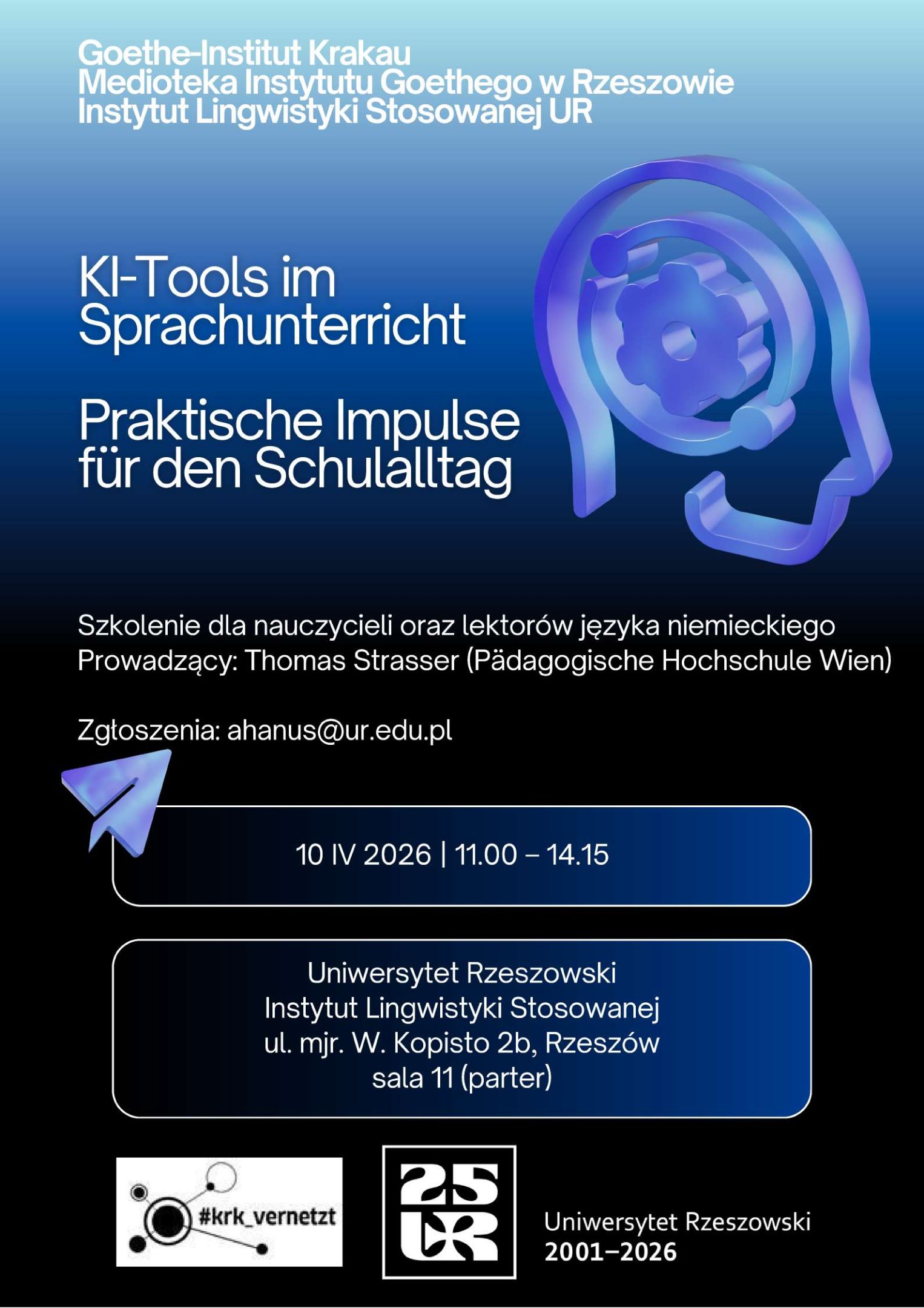 Szkolenie skierowane do nauczycieli oraz lektorów języka niemieckiego odbędzie się 10 kwietnia 2026 r. na Uniwersytecie Rzeszowskim w godz.: 11.00 – 14.15