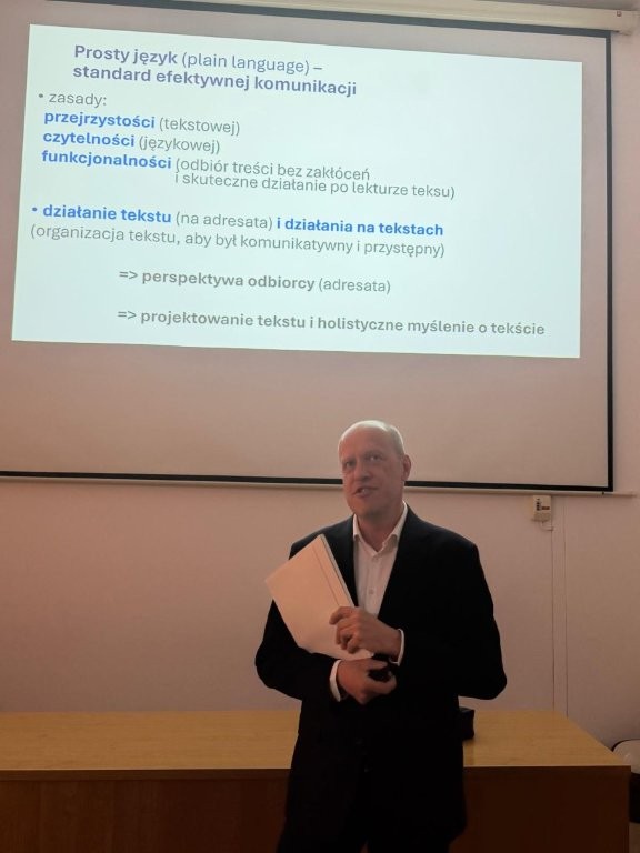 Istotnym obszarem jego działalności badawczej pozostaje również problematyka zrozumiałości i efektywności tekstów urzędowych, rozwijana na Uniwersytecie Wrocławskim. W ramach tych badań dr hab. Marcin Poprawa wraz z dr hab. Tomaszem Piekotem utworzyli Pracownię Prostej Polszczyzny UWr, która stała się jednym z ważnych ośrodków rozwijających badania nad prostym językiem w Polsce. Ten właśnie obszar stanowił bezpośredni kontekst tematyczny wykładu, który dotyczył prostego języka jako standardu komunikacji administracyjnej.