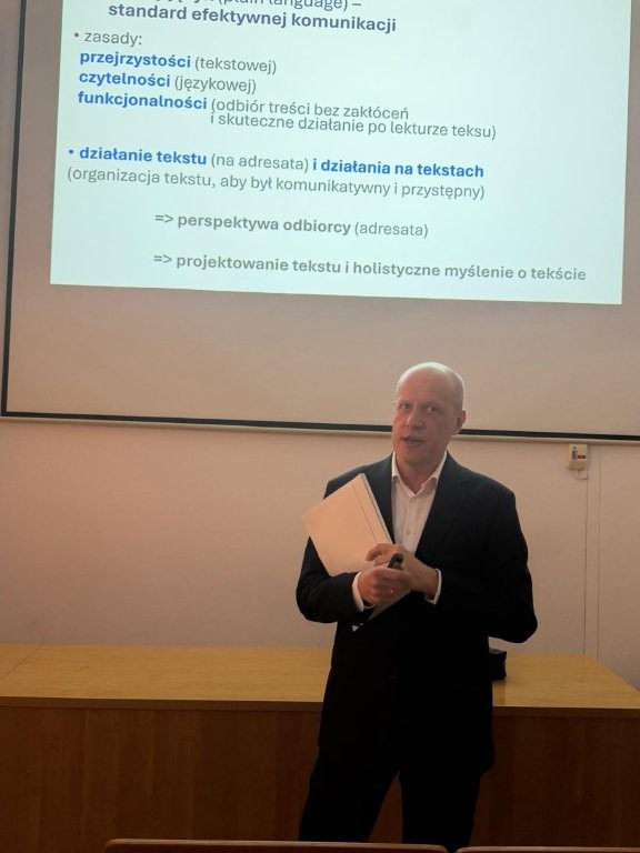 W centrum wystąpienia znalazła się koncepcja prostego języka (plain language) jako współczesnego standardu efektywnej komunikacji instytucjonalnej. Prelegent przedstawił rozwój tej idei w Polsce, wskazując zarówno na jej zakorzenienie w refleksji naukowej, jak i na jej implementacje w praktykach administracyjnych. Omówiono m.in. model teoretyczny M. Hadryan, inicjatywy I Kongresu Języka Urzędowego oraz współczesne podejścia rozwijane w środowiskach akademickich zajmujących się komunikacją publiczną i jej przystępnością.