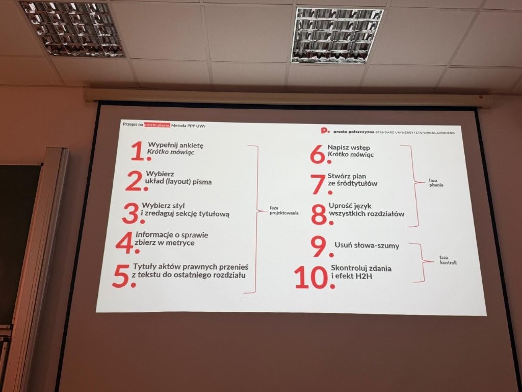 Istotnym elementem wystąpienia była prezentacja wrocławskiego modelu efektywnej komunikacji MSGR, obejmującego cztery poziomy analizy i projektowania tekstu: merytorykę, strukturę, gramatykę oraz relacje. Model ten umożliwia całościowe ujęcie tekstów urzędowych zarówno w wymiarze ich organizacji formalnej, jak i funkcjonowania komunikacyjnego. Podkreślono, że skuteczność prostego języka nie polega na upraszczaniu treści merytorycznych, lecz na ich odpowiednim organizowaniu w sposób zapewniający wysoką efektywność komunikacyjną.