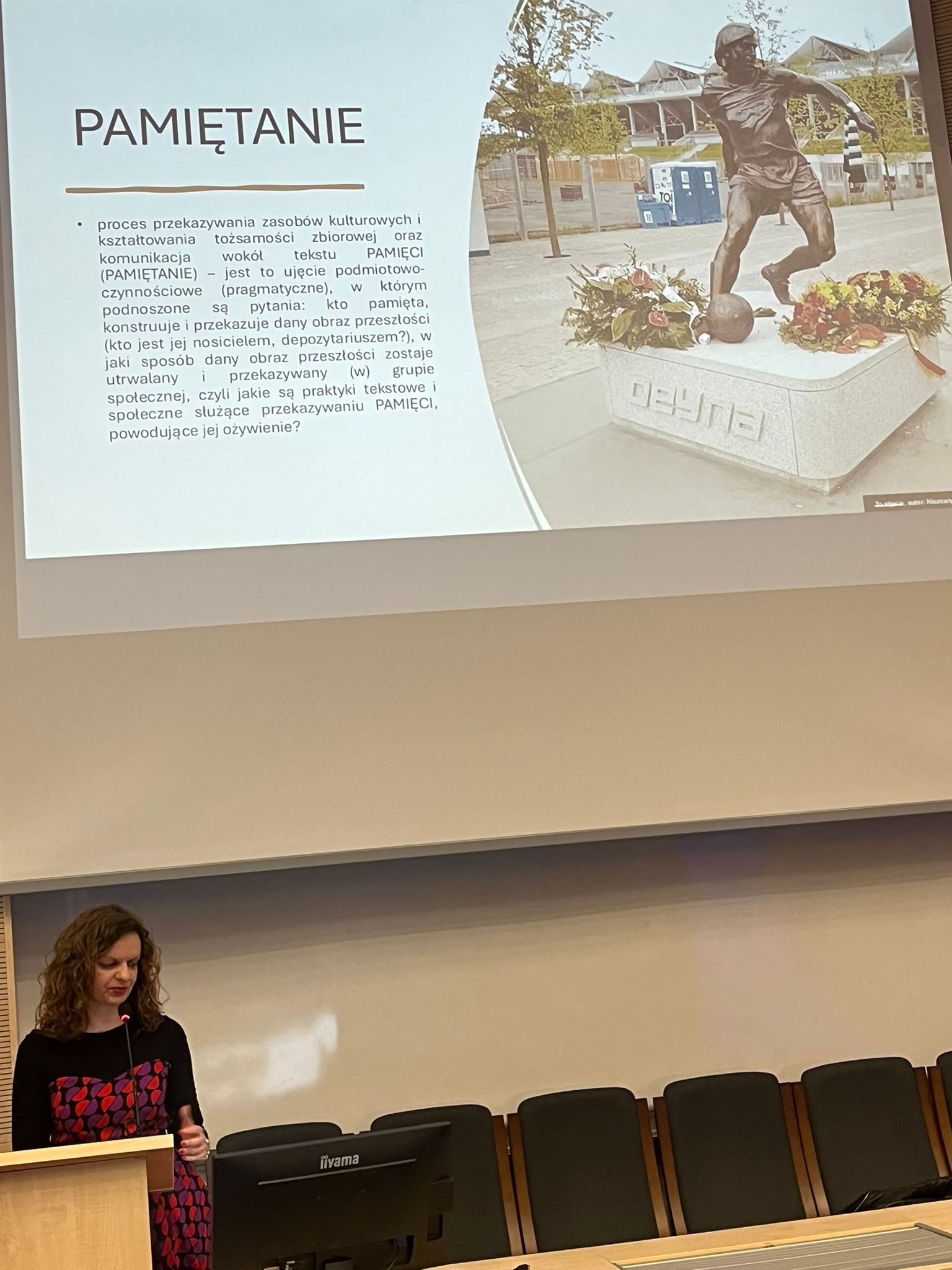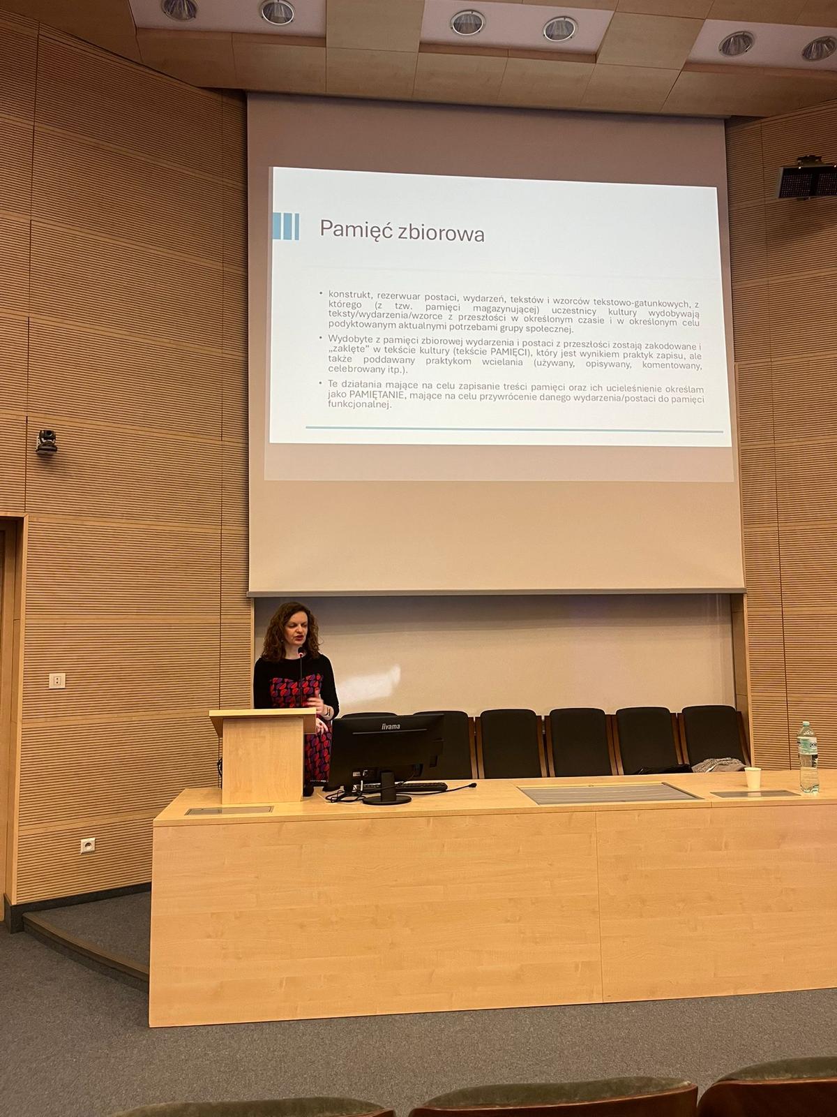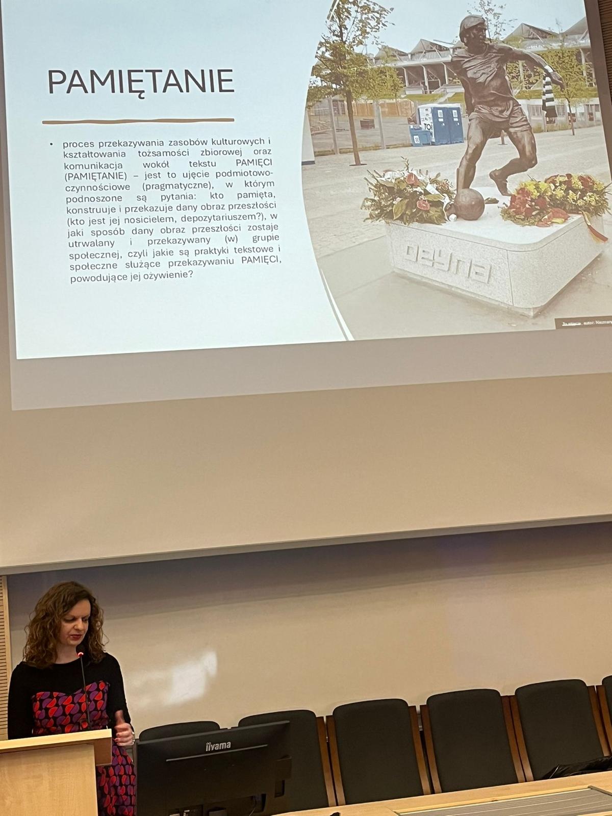 W swoim wystąpieniu badaczka przedstawiła autorskie podejście metodologiczne do analizy dyskursów pamięci zbiorowej. W centrum refleksji znalazło się rozróżnienie między pamięcią zbiorową — rozumianą jako kulturowo utrwalony obraz przeszłości — a pamiętaniem ujmowanym jako dynamiczna praktyka społeczna i komunikacyjna, w ramach której przeszłość podlega nieustannej aktualizacji, reinterpretacji i negocjowaniu znaczeń.