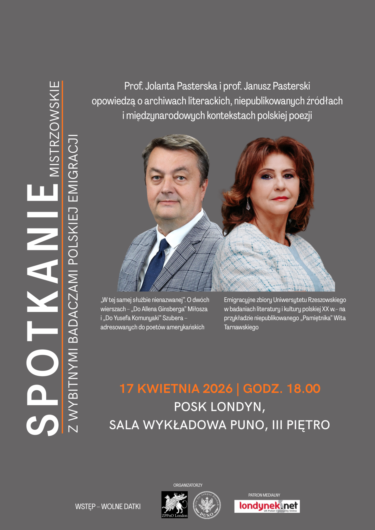 Na zaproszenie Związku Pisarzy Polskich na Obczyźnie w piątek 17 kwietnia 2026 roku prof. dr hab. Jolanta Pasterska i prof. dr hab. Janusz Pasterski wystąpili z wykładami poświęconymi polskiej literaturze emigracyjnej. Spotkanie odbyło się w sali wykładowej Polskiego Uniwersytetu na Obczyźnie w Polskim Ośrodku Społeczno-Kulturalnym w Londynie. Z kolei w sobotę 18 kwietnia wzięli udział w międzynarodowej konferencji naukowej „Wokół Stanisława Młodożeńca”, zorganizowanej przez Ośrodek Badań Dziedzictwa Emigracji Polskiej przy Związku Pisarzy Polskich na Obczyźnie w Londynie.