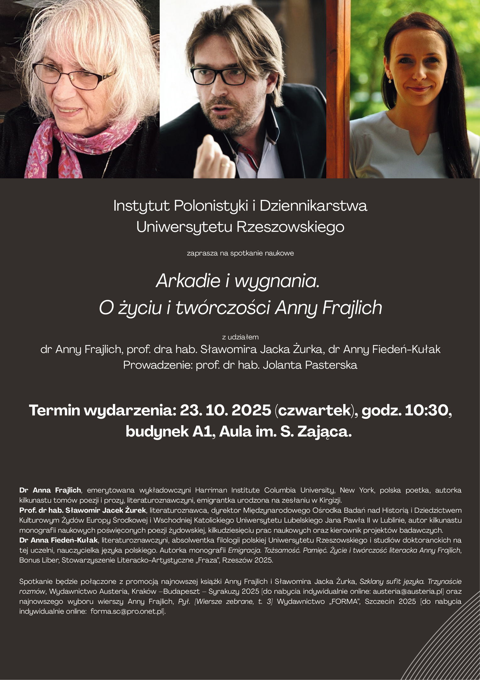 Spotkanie naukowe „Arkadie i wygnania. O życiu i twórczości Anny Frajlich” z udziałem dr Anny Frajlich, prof. dra hab. Sławomira Jacka Żurka, dr Anny Fiedeń-Kułak