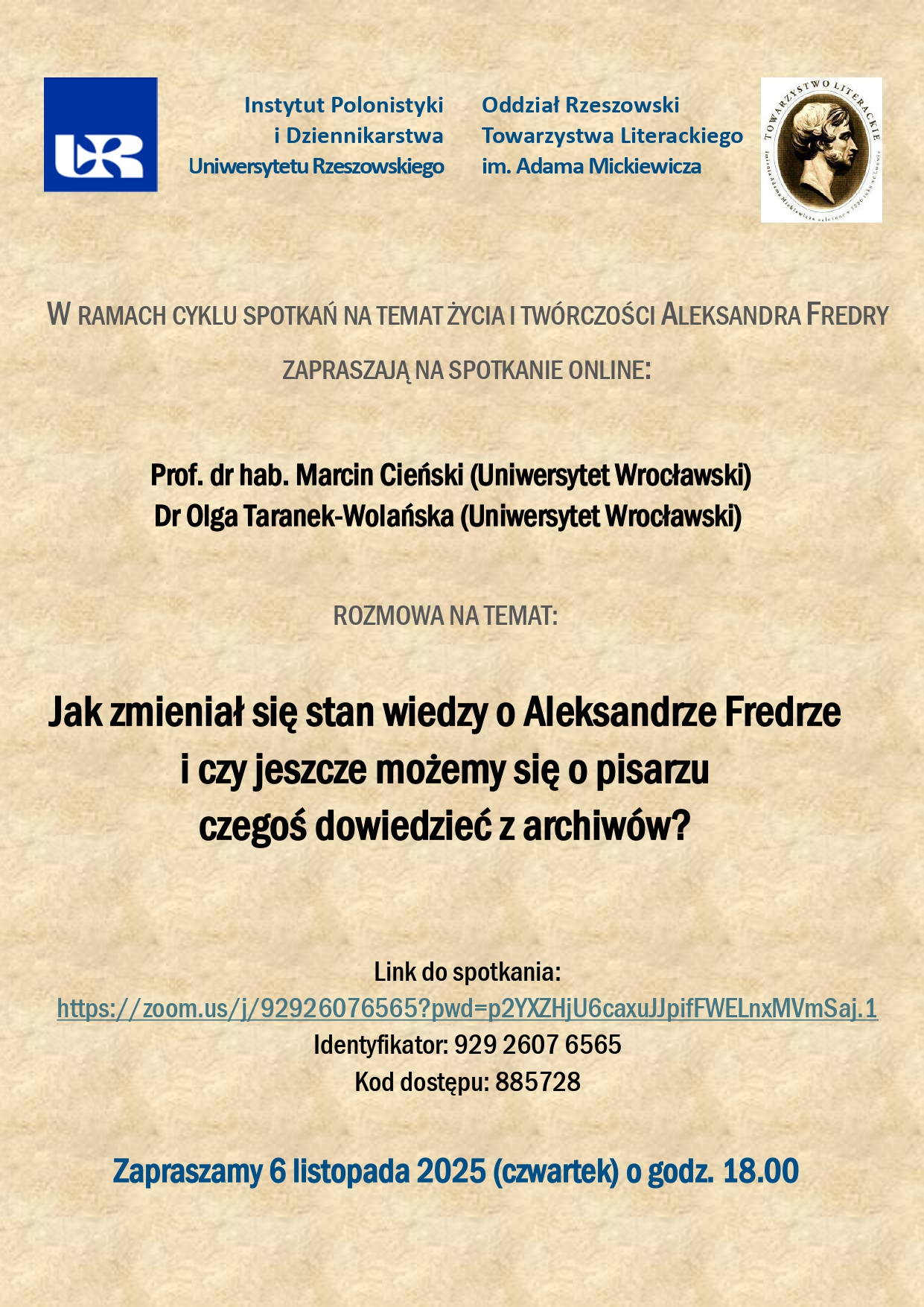 Instytut Polonistyki i Dziennikarstwa Uniwersytetu Rzeszowskiego oraz Oddział Rzeszowski Towarzystwa Literackiego im. Adama Mickiewicza zapraszają na spotkanie online w ramach cyklu poświęconego życiu i twórczości Aleksandra Fredry.