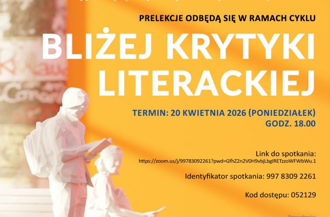 zobacz więcej Zaproszenie na spotkanie w ramach cyklu prelekcji „Bliżej krytyki literackiej”. 20 kwietnia 2026 r. (poniedziałek), godz. 18.00