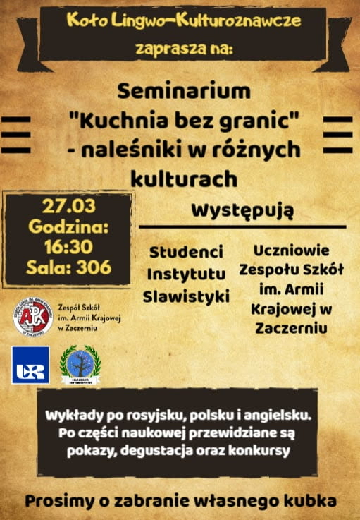 Instytut Slawistyki serdecznie zaprasza do udziały w seminarium "Kuchnia bez granic - naleśniki w różnych kulturach" w dniu 27.03.2025 r. o godz 16:30 w sali 306, budynek A3. Referaty w języku rosyjskim, polskim i angielskim wygłoszą nasi Studenci oraz Uczniowie Zespołu Szkół im Armii Krajowej w Zaczerniu. Po wystąpieniach planowana jest degustacja i konkursy. Organizatorzy proszą o przyniesienie własnego kubka - dbajmy o zrównoważony rozwój!