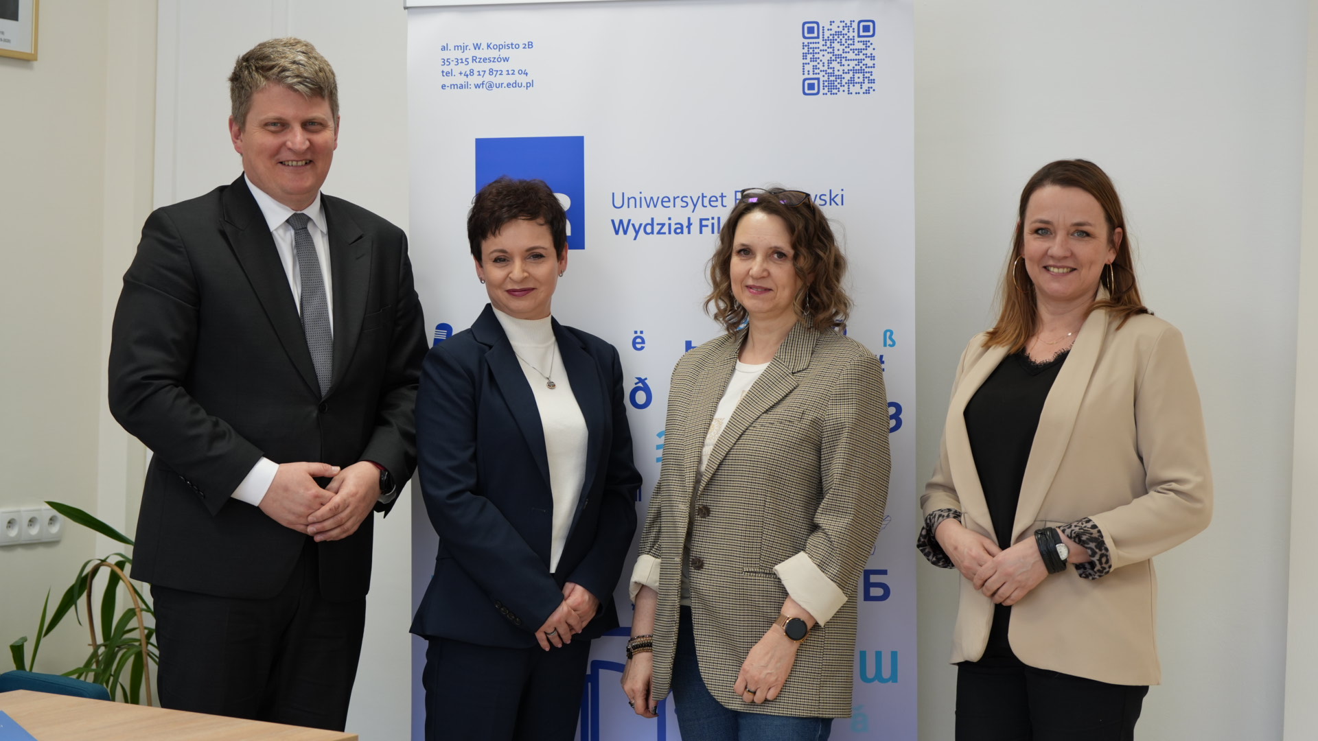 30 stycznia Pani Dziekan Wydziału Filologicznego, dr hab. Agnieszka Myszka, prof. UR, spotkała się z Panią Magdaleną Dziuban, dyrektorem II Liceum Ogólnokształcącego im. Marii Skłodowskiej-Curie w Sanoku, Panią Małgorzatą Gądelą, naczelnikiem Wydziału Społeczno-Oświatowego Starostwa Powiatowego w Sanoku oraz Panem Damianem Biskupem, wicestarostą Powiatu Sanockiego. W spotkaniu wzięli również udział przedstawiciele Instytutu Slawistyki, ponieważ poświęcone ono było nawiązaniu współpracy w zakresie wiodącego w instytucie kierunku nauczanie języków obcych – język angielski i rosyjski. Dyskusja koncentrowała się na możliwościach połączenia potencjału dydaktyczno-naukowego Wydziału Filologicznego z doświadczeniem i potrzebami instytucji zewnętrznych. W toku rozmów podkreślono znaczenie długofalowej, systematycznej współpracy, a jako kolejny etap wspólnych działań zaproponowano utworzenie klasy akademickiej w II LO w Sanoku. Współpraca przyniesie wymierne korzyści obu stronom, sprzyjając wzmacnianiu relacji instytucjonalnych oraz realizacji przyszłych wspólnych przedsięwzięć. Spotkanie zostało zainicjowane przez dr Marię Puk – kierownika kierunku nauczanie języków obcych – język angielski i rosyjski oraz Panią Dyrektor Magdalenę Dziuban.