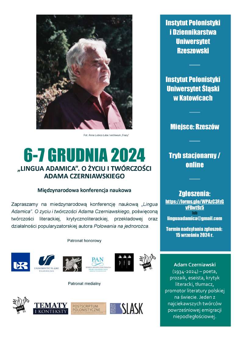 Instytut Polonistyki i Dziennikarstwa Uniwersytetu Rzeszowskiego oraz Instytut Polonistyki Uniwersytetu Śląskiego w Katowicach serdecznie zapraszają do udziału w konferencji naukowej „Lingua Adamica”. O życiu i twórczości Adama Czerniawskiego, która odbędzie się w dniach 6-7 grudnia 2024 r. w Rzeszowie. Na zgłoszenia czekamy do 15 września 2024 r. Prosimy o nadesłanie wypełnionego formularza zgłoszeniowego na adres: linguaadamica@gmail.com lub dokonanie zgłoszenia pod adresem: https://forms.gle/WPAzC3FzGvFBwt9z5