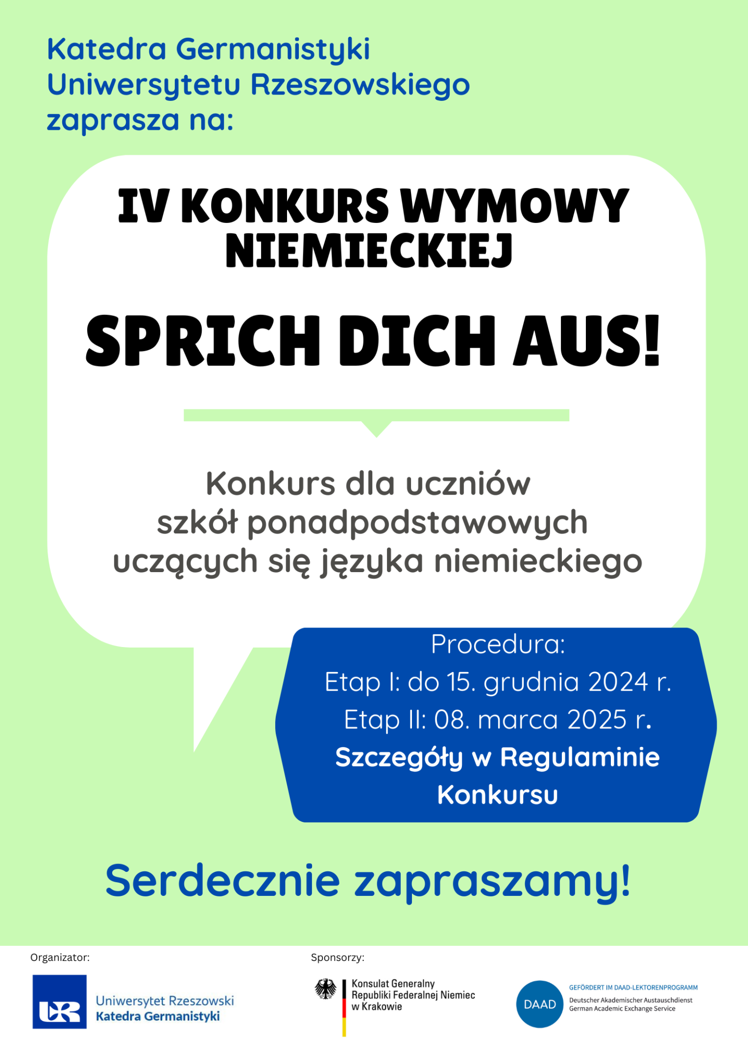 Instytut Germanistyki Uniwersytetu Rzeszowskiego zaprasza uczniów szkół średnich zainteresowanych językiem niemieckim do udziału w V Konkursie Wymowy Niemieckiej. Szczegóły w załączonych plikach.