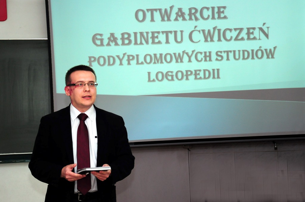 Gabinet powstał z inicjatywy Dyrekcji Instytutu Filologii Polskiej, Kierownika Podyplomowych Studiów Logopedii oraz Urszuli Wojnarowskiej – pani logopedy współpracującej ze studiami. Jest czynny dwa razy w tygodniu. Wyposażenie gabinetu (urządzenia do terapii rotacyzmu, jąkania, programy komputerowe, pomoce do ćwiczeń oddechowych, fonacyjnych, artykulacyjnych, zabawki wspomagające rozwój mowy) zostało sfinansowane ze środków studiów. Pacjenci gabinetu (na razie 12 osób) to głównie dzieci z bardzo zróżnicowanymi wadami wymowy i niezakończonym rozwojem mowy.