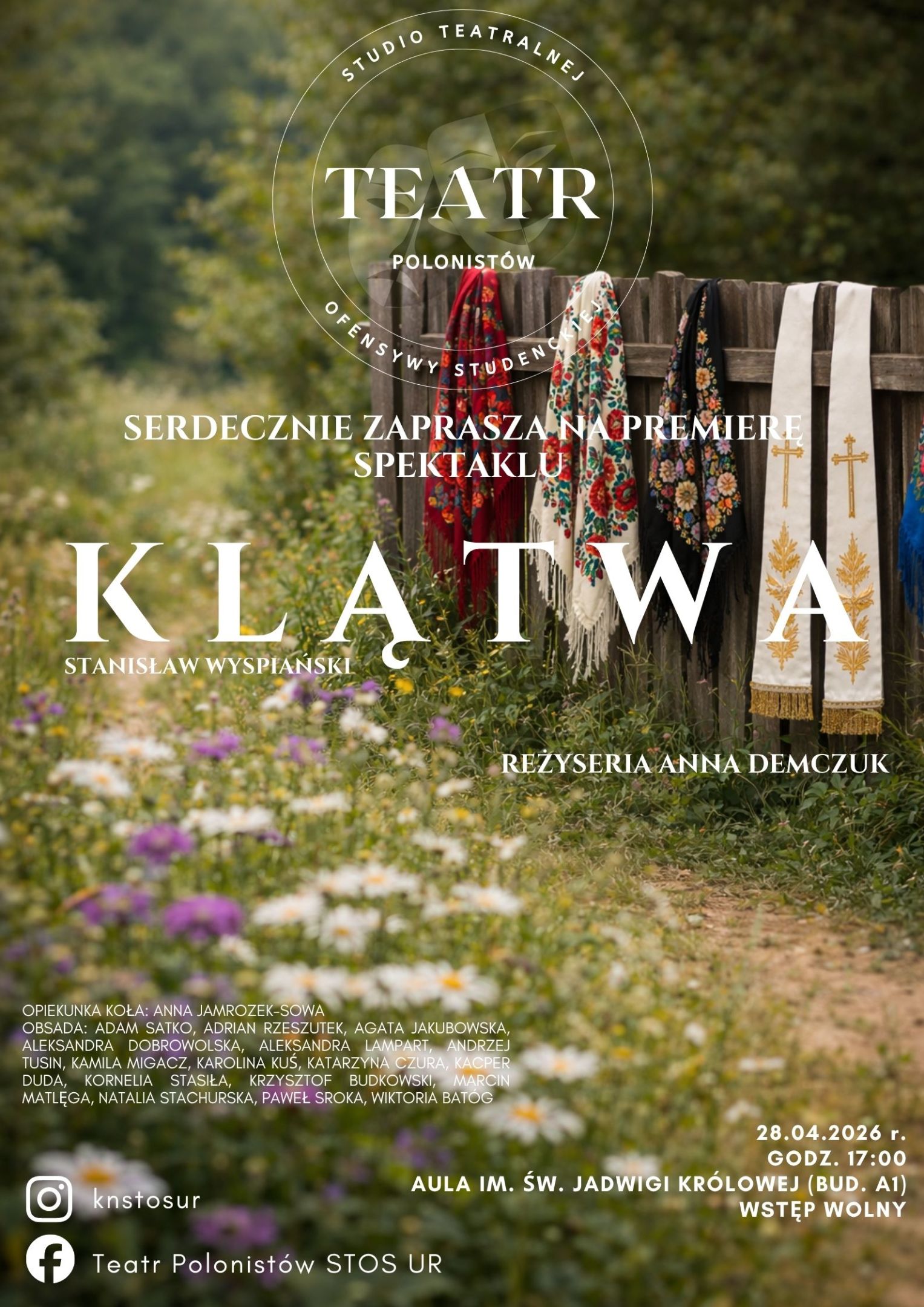 Klątwa to dramat Stanisława Wyspiańskiego, opublikowany na łamach krakowskiego „Życia” w 1899. To swoista antyczna tragedia przeniesiona w realia galicyjskiej wsi, osnuta wokół konfliktu lokalnej społeczności z księdzem. Tłem sporu jest tytułowa klątwa suszy i głodu. Interpretacja studentów z pewnością niejednego zaskoczy.