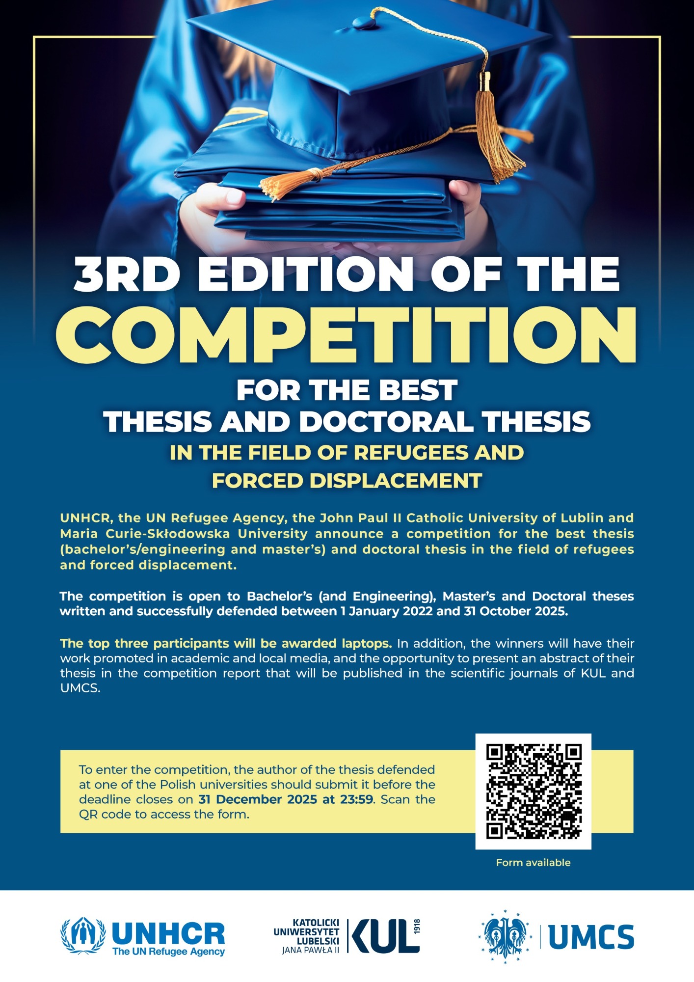 On behalf of the United Nations High Commissioner for Refugees (UNHCR) in Poland, the John Paul II Catholic University of Lublin (KUL), and the Maria Curie-Skłodowska University (UMCS) in Lublin, we are pleased to invite your students to participate in the third national edition of the competition for the best Bachelor's (and Engineering), Master's and Doctoral theses the field of forced displacement and/or refugee studies.