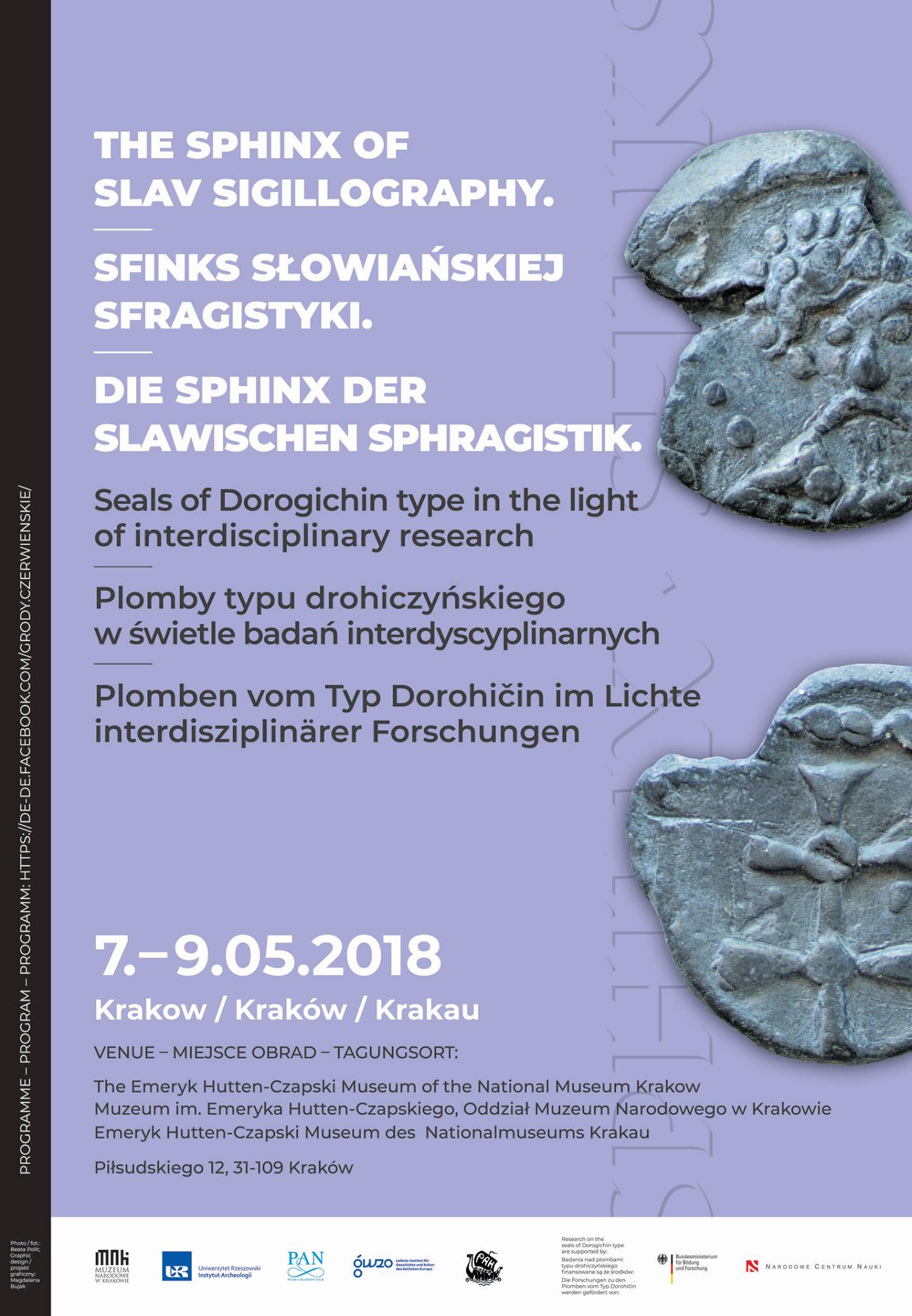 Konferencja Konferencja została zorganizowana w ramach projektu naukowego NCN pt. Sfinks słowiańskiej sfragistyki – plomby typu drohiczyńskiego z Czermna na wschodnioeuropejskim tle porównawczym. Termin/miejsce: 7-9 maja 2018 r., Muzeum im. Emeryka Hutten-Czapskiego (Oddział Muzeum Narodowego w Krakowie). |