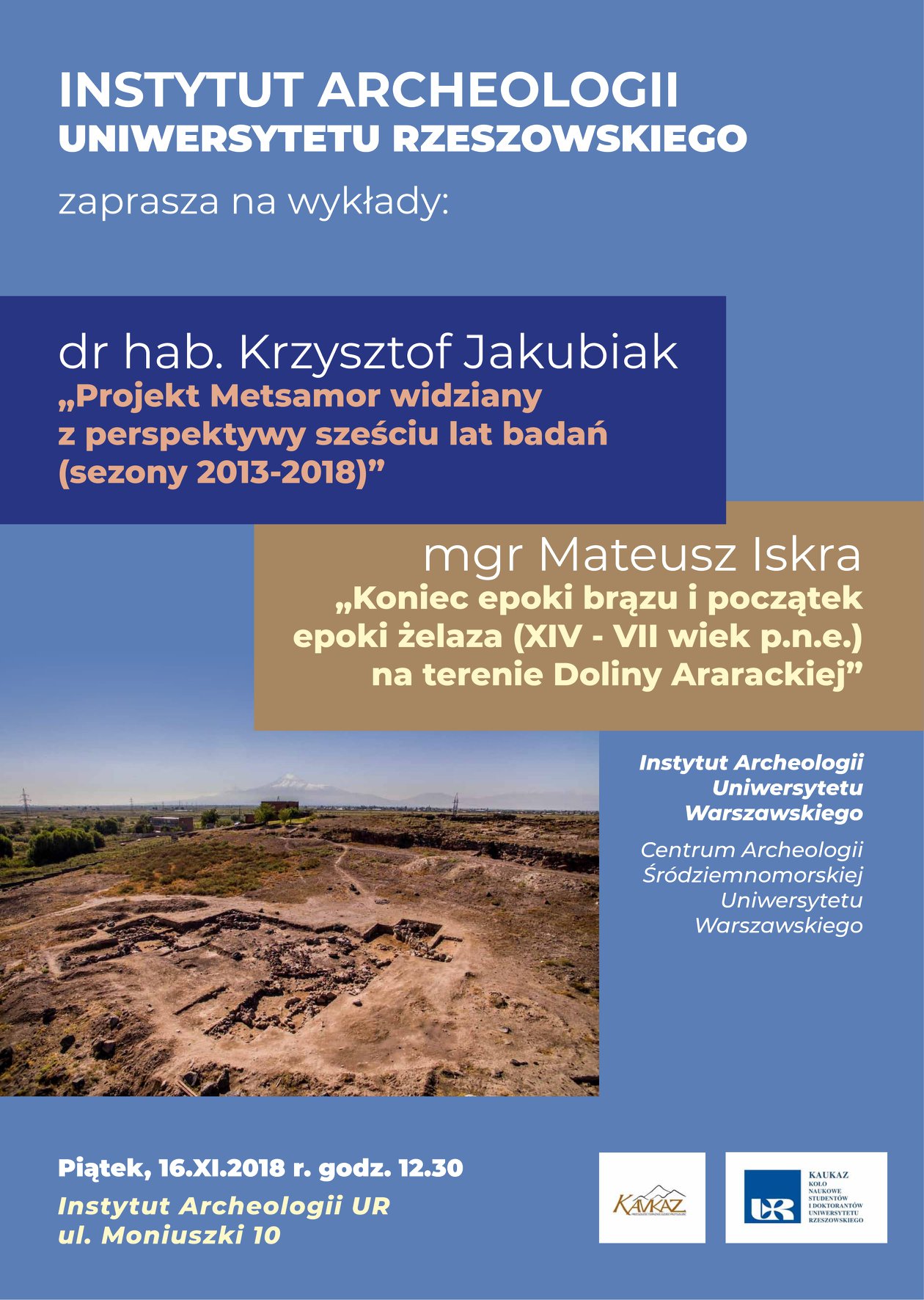 Wykłady poświęcone badaniom archeologicznym prowadzonym w Armenii: Termin/miejsce: 16 listopada 2018 r., godz. 12:30, w budynku Instytutu Archeologii UR. |